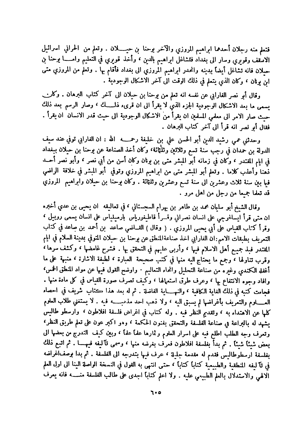 وحَدثني عمي رشيد الدّين أَبُو الْحسن عَليّ بن خَليفَة رَحمَه الله أَن الفارابي توفّي عِنْد سيف الدولة بن حمدَان فِي رَجَب سنة تسع وَثَلَاثِينَ وثلاثمائة وَكَانَ أَخذ الصِّنَاعَة عَن يوحنا بن حيلان بِبَغْدَاد فِي أَيَّام المقتدر وَكَانَ فِي زَمَانه أَبُو المبشر مَتى بن يونان وَكَانَ أسن من أبي نصر وَأَبُو نصر أحد ذهنا وأعذب كلَاما