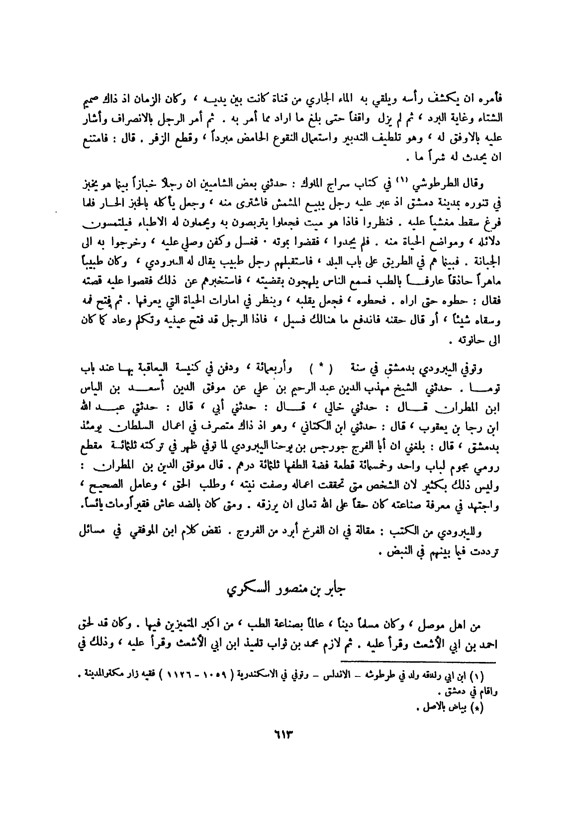 حَدثنِي الشَّيْخ مهذب الدّين عبد الرَّحِيم بن عَليّ عَن موفق الدّين أسعد بن إلْيَاس ابْن المطران قَالَ حَدثنِي خَالِي قَالَ حَدثنِي أبي قَالَ حَدثنِي عبد الله ابْن رجا بن يَعْقُوب قَالَ حَدثنِي ابْن الكتاني وَهُوَ إِذا ذَاك متصرف فِي أَعمال السُّلْطَان يَوْمئِذٍ بِدِمَشْق قَالَ بَلغنِي أَن أَبَا الْفرج جورجس بن يوحنا اليبرودي لما توفّي ظهر فِي تركته ثلثمِائة مقطع رومي مجوم لباب وَاحِد وَخَمْسمِائة قِطْعَة فضَّة ألطفها ثلثمِائة دِرْهَم