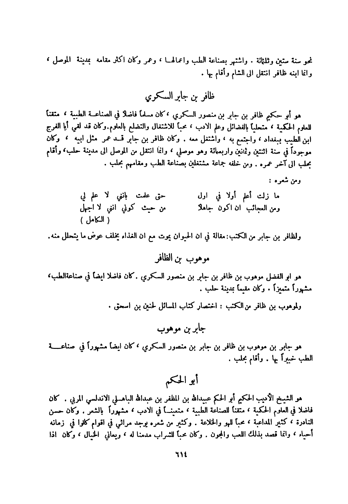 هُوَ أَبُو حَكِيم ظافر بن جَابر بن مَنْصُور السكرِي كَانَ مُسلما فَاضلا فِي الصِّنَاعَة الطبية متقنا للعلوم الْحكمِيَّة متحليا بالفضائل وَعلم الْأَدَب محبا للاشتغال والتضلع بالعلوم