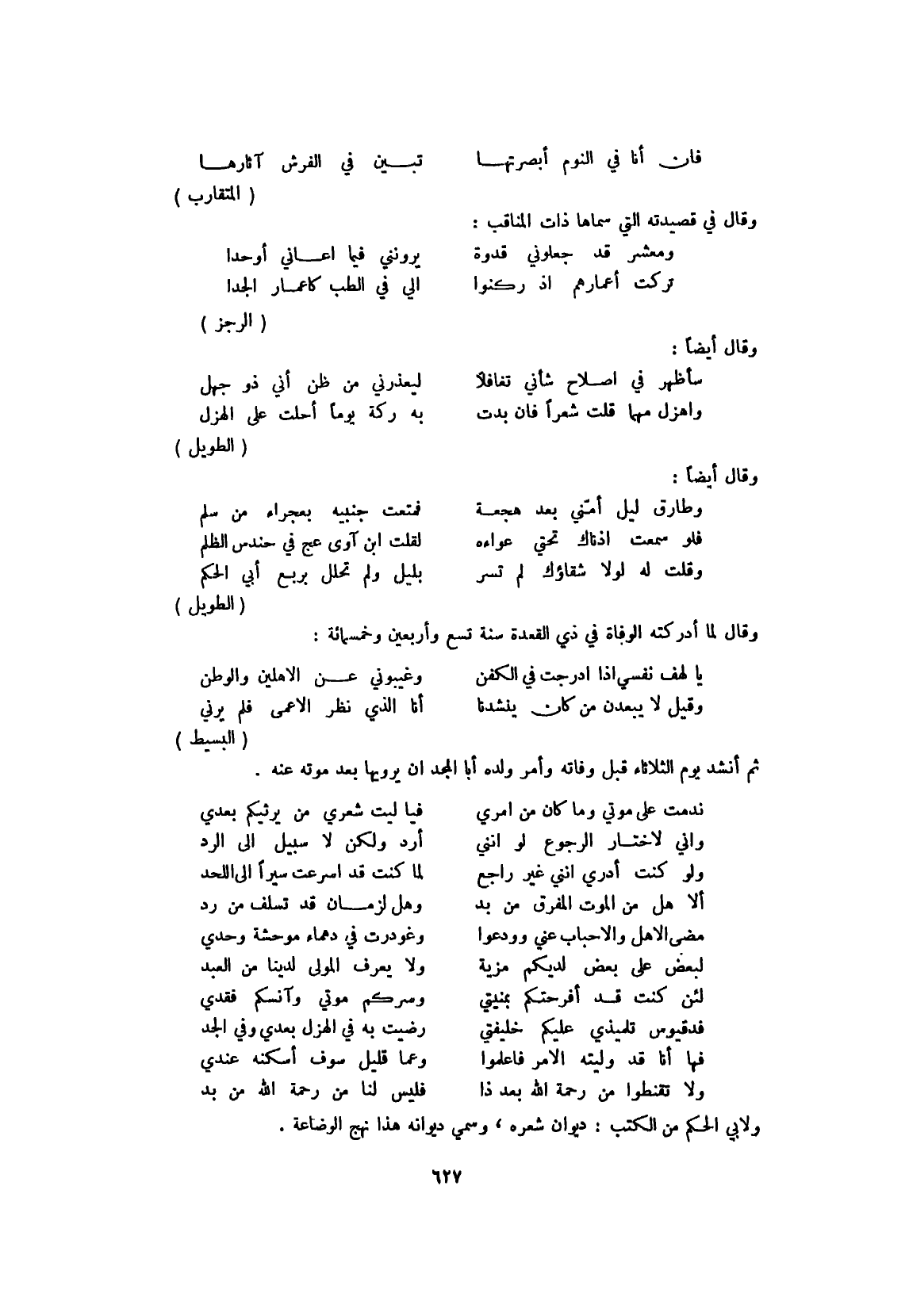 ثمَّ أنْشد يَوْم الثُّلَاثَاء قبل وَفَاته وَأمر وَلَده أَبَا الْمجد ان يَرْوِيهَا بعد مَوته عَنهُ