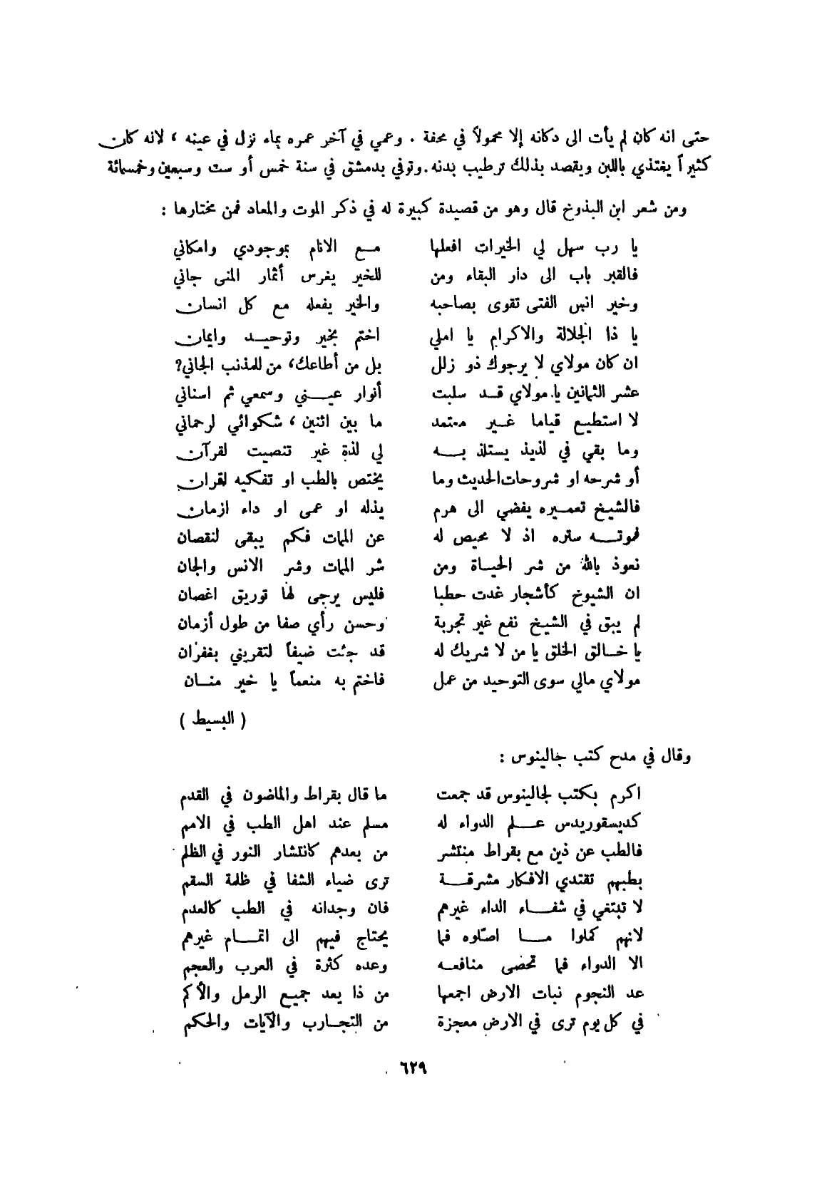 (اكرم بكتب لِجَالِينُوسَ قد جمعت ... مَا قَالَ بقراط والماضون فِي الْقدَم)