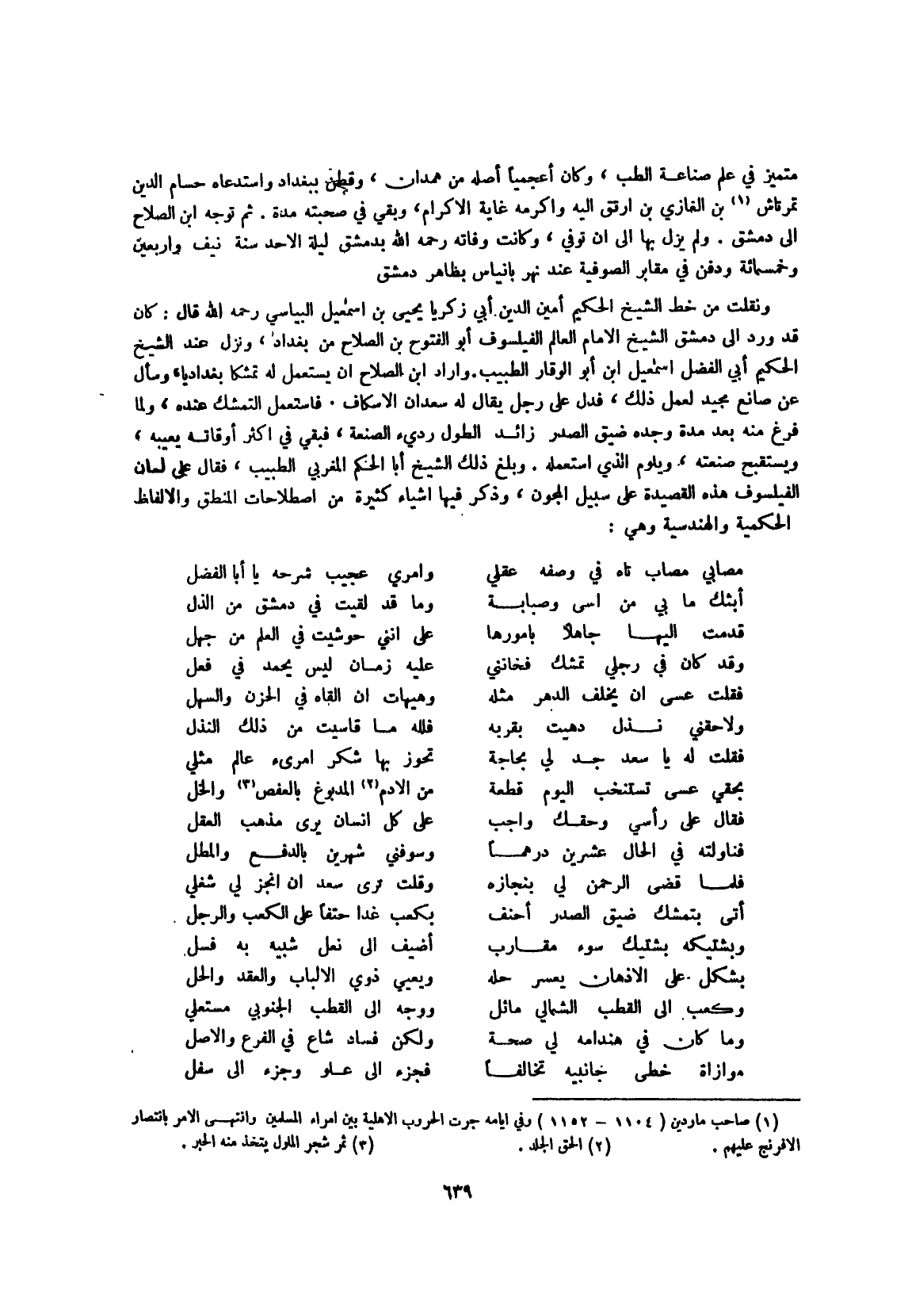 متميز فِي علم صناعَة الطِّبّ وَكَانَ أعجميا أَصله من هَمدَان وقطن بِبَغْدَاد واستدعاه حسام الدّين تمرتاش بن الْغَازِي بن أرتق إِلَيْهِ وأكرمه غَايَة الْإِكْرَام وَبَقِي فِي صحبته مُدَّة