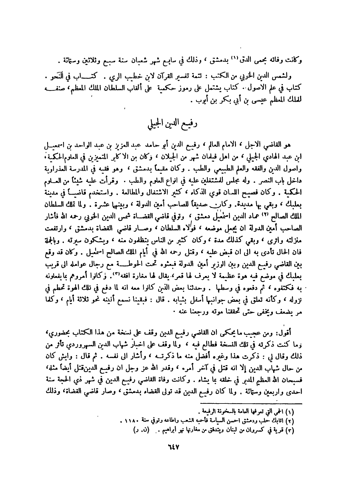أَقُول وَمن عَجِيب مَا يحْكى أَن القَاضِي رفيع الدّين وقف على نُسْخَة من هَذَا الْكتاب بحضوري وَمَا كنت ذكرته فِي تِلْكَ النُّسْخَة فطالع فِيهِ وَلما وقف على أَخْبَار شهَاب الدّين السهروردي تأثر من ذَلِك وَقَالَ لي ذكرت هَذَا وَغَيره أفضل مِنْهُ مَا ذكرته وَأَشَارَ إِلَى نَفسه