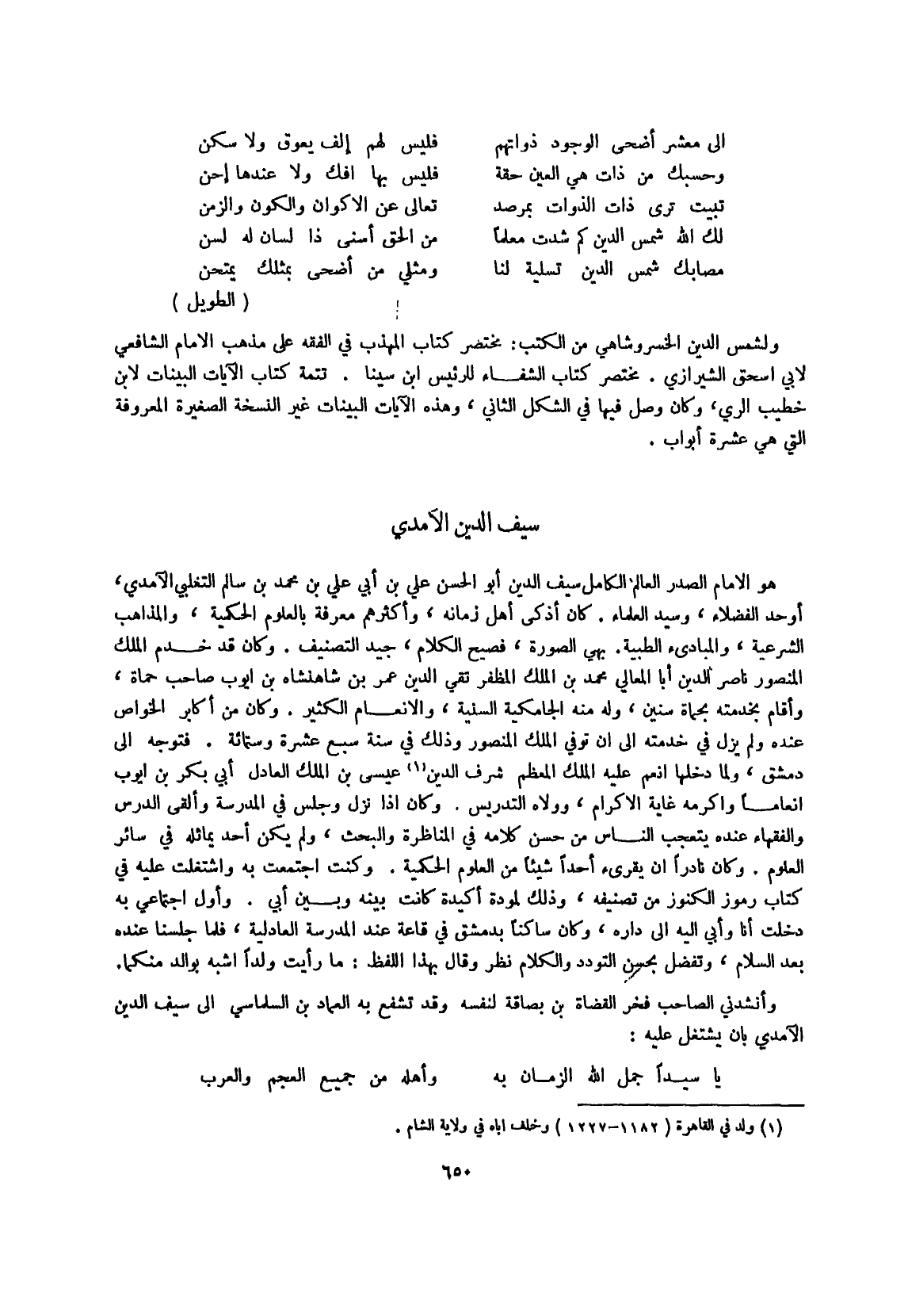وأنشدني الصاحب فَخر الْقُضَاة بن بصاقة لنَفسِهِ وَقد تشفع بِهِ الْعِمَاد بن السلماسي إِلَى سيف الدّين الْآمِدِيّ بِأَن يشْتَغل عَلَيْهِ
