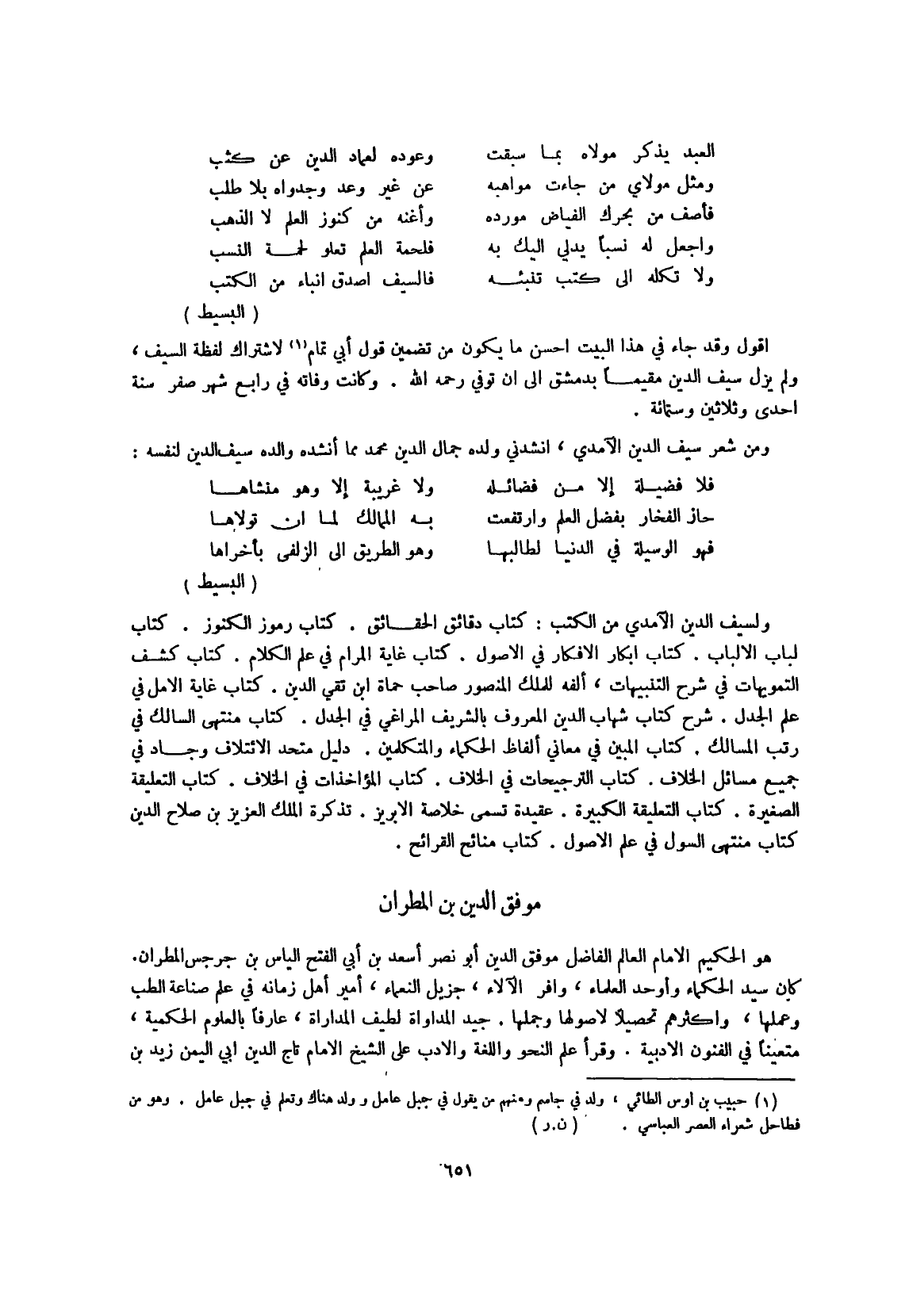 وَمن شعر سيف الدّين الْآمِدِيّ أَنْشدني وَلَده جمال الدّين مُحَمَّد مِمَّا أنْشدهُ وَالِده سيف الدّين لنَفسِهِ