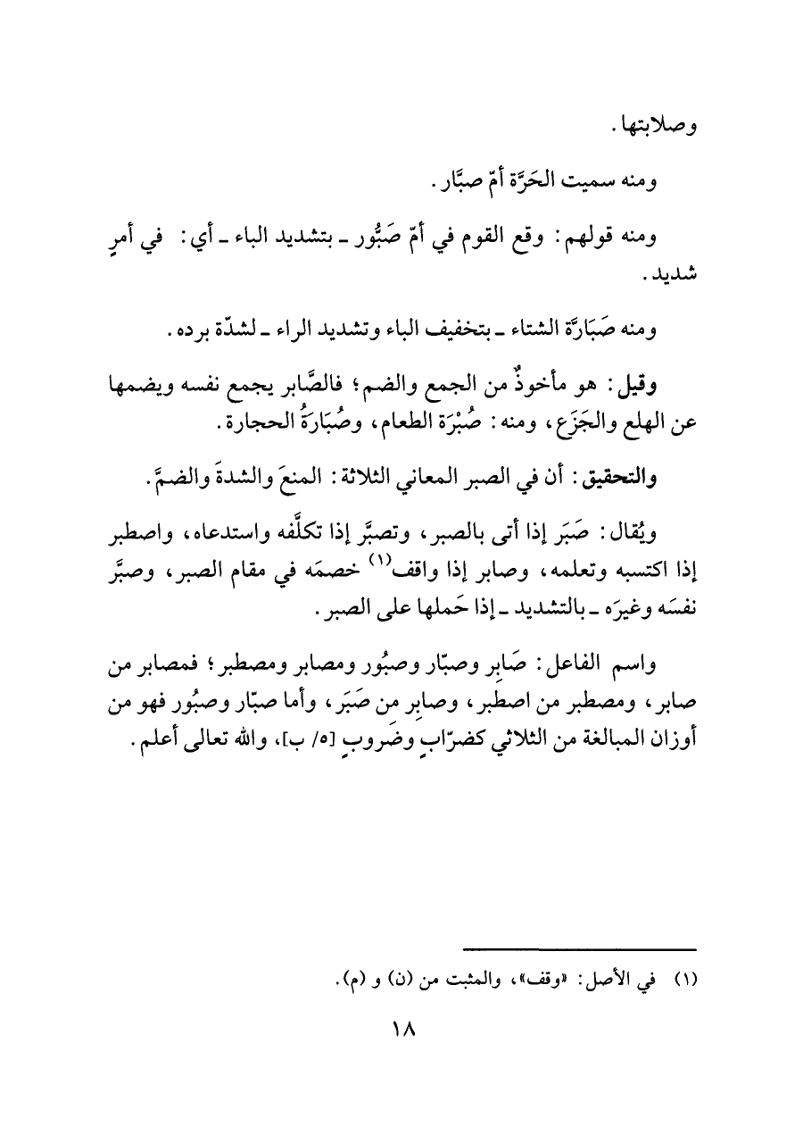ويُقال: صبَر إذا أتى بالصبر، وتصبَّر إذا تكلَّفه واستدعاه، واصطبر إذا اكتسبه وتعلمه، وصابر إذا واقف (¬١) خصمَه في مقام الصبر، وصبَّر نفسَه وغيرَه -بالتشديد- إذا حَملها على الصبر.