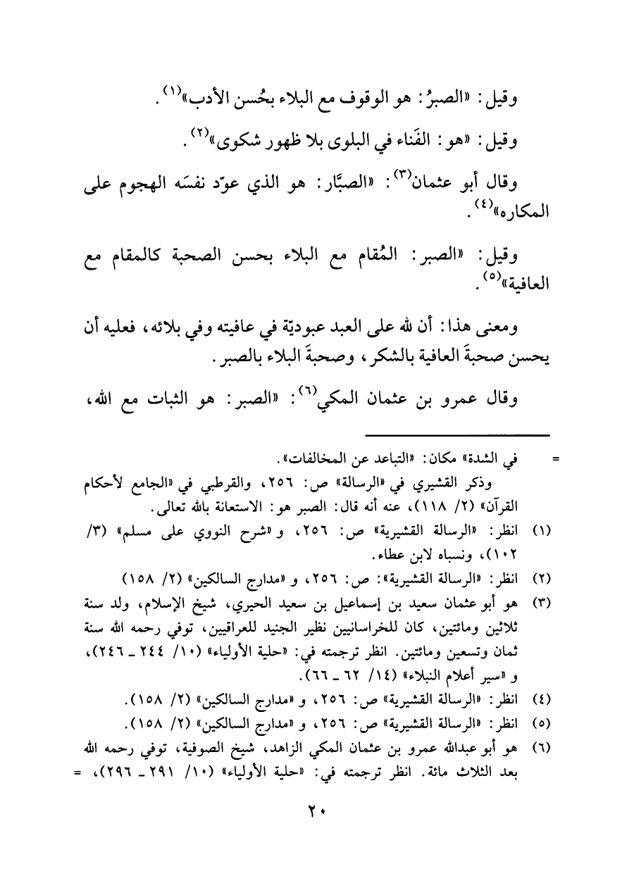 (¬٥) انظر: "الرسالة القشيرية" ص: ٢٥٦، و"مدارج السالكين" (٢/ ١٥٨).