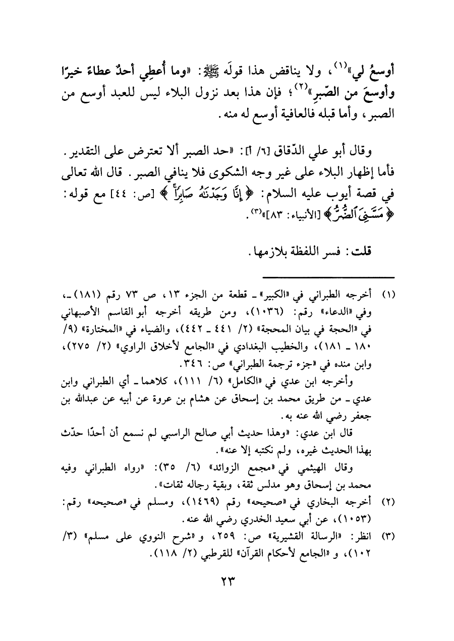 وقال أبو علي الدّقاق: "حد الصبر ألا تعترض على التقدير. فأما إظهار البلاء على غير وجه الشكوى فلا ينافي الصبر. قال اللَّه تعالى في قصة أيوب عليه السلام: {إِنَّا وَجَدْنَاهُ صَابِرًا} [ص: ٤٤] مع قوله: {مَسَّنِيَ الضُّرّ} [الأنبياء: ٨٣] " (¬٣).