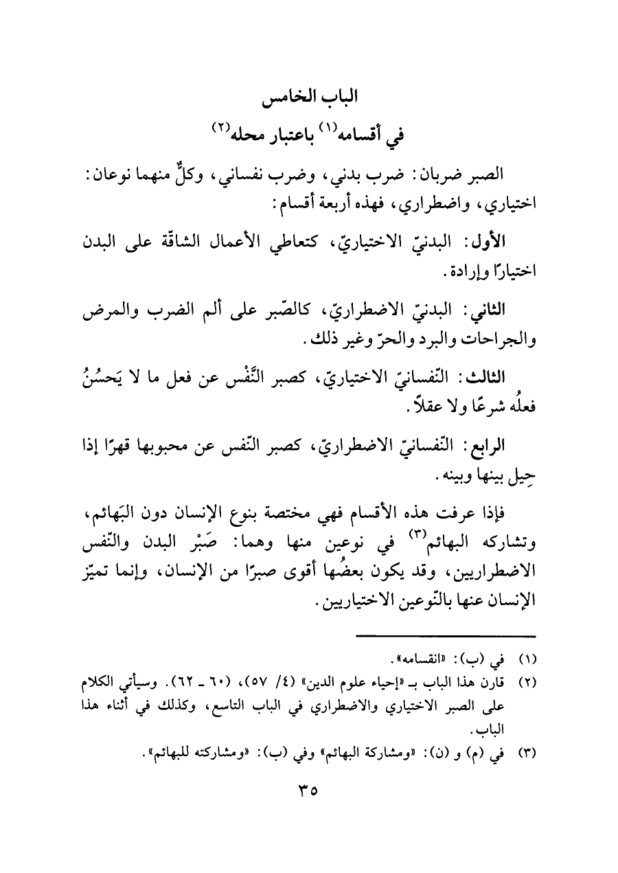 (¬٢) قارن هذا الباب بـ "إحياء علوم الدين" (٤/ ٥٧)، (٦٠ - ٦٢). وسيأتي الكلام على الصبر الاختياري والاضطراري في الباب التاسع، وكذلك في أثناء هذا الباب.