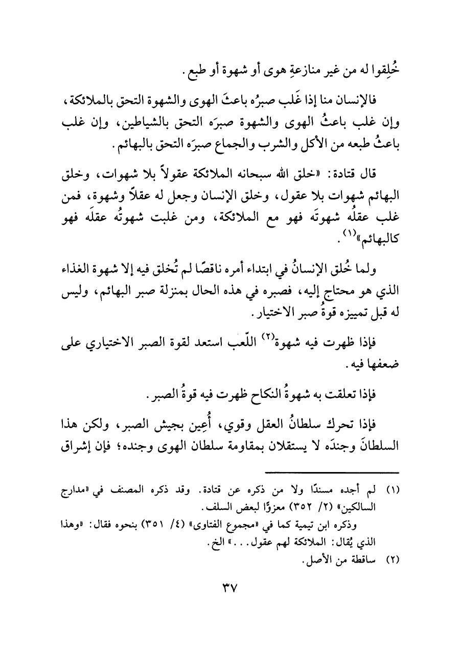 قال قتادة: "خلق اللَّه سبحانه الملائكة عقولًا بلا شهوات، وخلق البهائم شهوات بلا عقول، وخلق الإنسان وجعل له عقلًا وشهوة، فمن غلب عقلُه شهوتَه فهو مع الملائكة، ومن غلبت شهوتُه عقلَه فهو كالبهائم" (¬١).