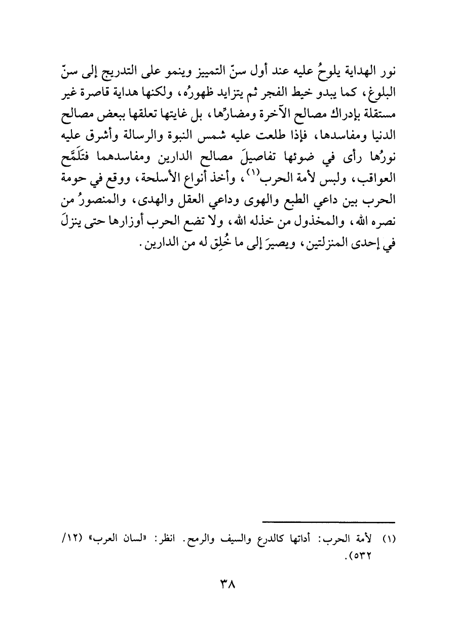 نور الهداية يلوحُ عليه عند أول سنّ التمييز وينمو على التدريج إلى سنّ البلوغ، كما يبدو خيط الفجر ثم يتزايد ظهورُه، ولكنها هداية قاصرة غير مستقلة بإدراك مصالح الآخرة ومضارِّها، بل غايتها تعلقها ببعض مصالح الدنيا ومفاسدها، فإذا طلعت عليه شمس النبوة والرسالة وأشرق عليه نورُها رأى في ضوئها تفاصيلَ مصالح الدارين ومفاسدهما فتَلَمَّح العواقب، ولبس لأمة الحرب (¬١)، وأخذ أنواع الأسلحة، ووقع في حومة الحرب بين داعي الطبع والهوى وداعي العقل والهدى، والمنصورُ من نصره اللَّه، والمخذول من خذله اللَّه، ولا تضع الحرب أوزارها حتى ينزلَ في إحدى المنزلتين، ويصيرَ إلى ما خُلِق له من الدارين.