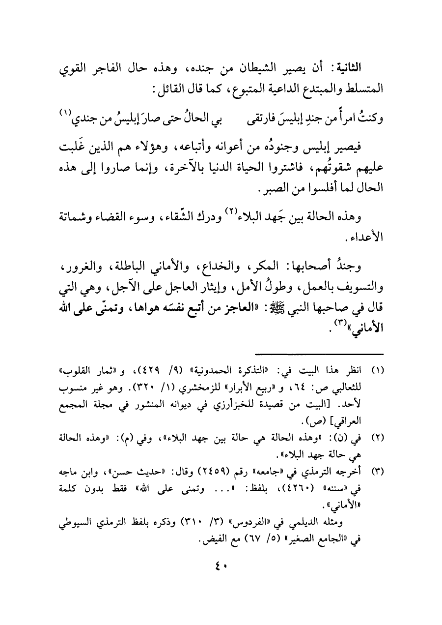 وجندُ أصحابها: المكر، والخداع، والأماني الباطلة، والغرور، والتسويف بالعمل، وطولُ الأمل، وإيثار العاجل على الآجل، وهي التي قال في صاحبها النبي -صلى اللَّه عليه وسلم-: "العاجز من أتبع نفسَه هواها، وتمنى على اللَّه الأماني" (¬٣).
