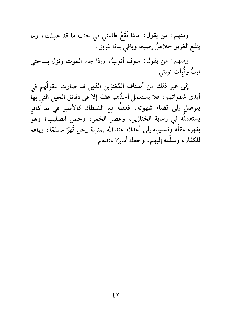 إلى غير ذلك من أصناف المُغترّين الذين قد صارت عقولُهم في أيدي شهواتهم، فلا يستعمل أحدُهم عقله إلا في دقائق الحيل التي بها يتوصل إلى قضاء شهوته. فعقلُه مع الشيطان كالأسير في يد كافرٍ يستعملُه في رعاية الخنازير، وعصر الخمر، وحمل الصليب؛ وهو بقهره عقلَه وتسليمِه إلى أعدائه عند اللَّه بمنزلة رجل قَهَرَ مسلمًا، وباعه للكفار، وسلَّمه إليهم، وجعله أسيرًا عندهم.