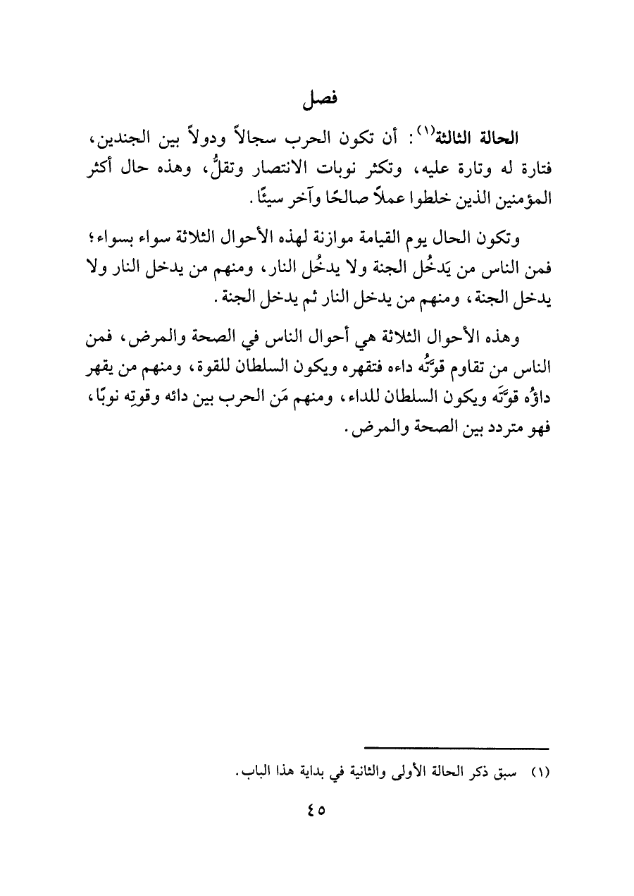 وهذه الأحوال الثلاثة هي أحوال الناس في الصحة والمرض، فمن الناس من تقاوم قوَّتُه داءه فتقهره ويكون السلطان للقوة، ومنهم من يقهر داؤُه قوَّتَه ويكون السلطان للداء، ومنهم مَن الحرب بين دائه وقوتِه نوبًا، فهو متردد بين الصحة والمرض.