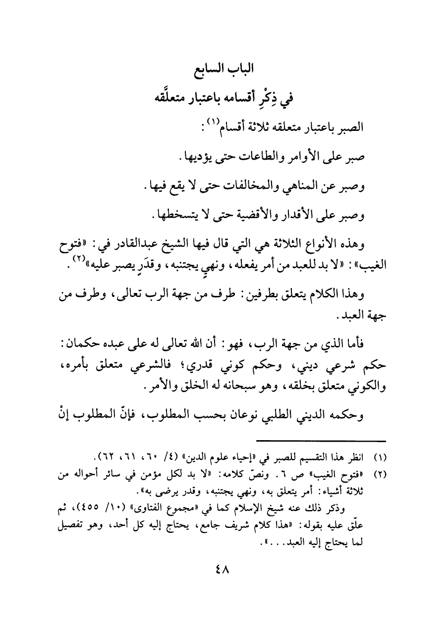 وهذه الأنواع الثلاثة هي التي قال فيها الشيخ عبد القادر في: "فتوح الغيب": "لا بد للعبد من أمر يفعله، ونهيٍ يجتنبه، وقدَرٍ يصبر عليه" (¬٢).