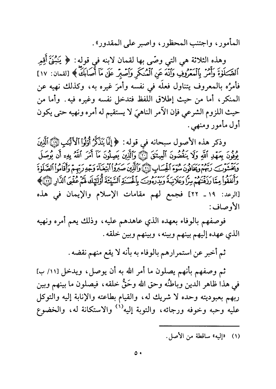 وذكر هذه الأصول سبحانه في قوله: {إِنَّمَا يَتَذَكَّرُ أُولُو الْأَلْبَابِ (١٩) الَّذِينَ يُوفُونَ بِعَهْدِ اللَّهِ وَلَا يَنْقُضُونَ الْمِيثَاقَ (٢٠) وَالَّذِينَ يَصِلُونَ مَا أَمَرَ اللَّهُ بِهِ أَنْ يُوصَلَ وَيَخْشَوْنَ رَبَّهُمْ وَيَخَافُونَ سُوءَ الْحِسَابِ (٢١) وَالَّذِينَ صَبَرُوا ابْتِغَاءَ وَجْهِ رَبِّهِمْ وَأَقَامُوا الصَّلَاةَ وَأَنْفَقُوا مِمَّا رَزَقْنَاهُمْ سِرًّا وَعَلَانِيَةً وَيَدْرَءُونَ بِالْحَسَنَةِ السَّيِّئَةَ أُولَئِكَ لَهُمْ عُقْبَى الدَّارِ (٢٢)} [الرعد: ١٩ - ٢٢] فجمع لهم مقامات الإِسلام والإيمان في هذه الأوصاف:
