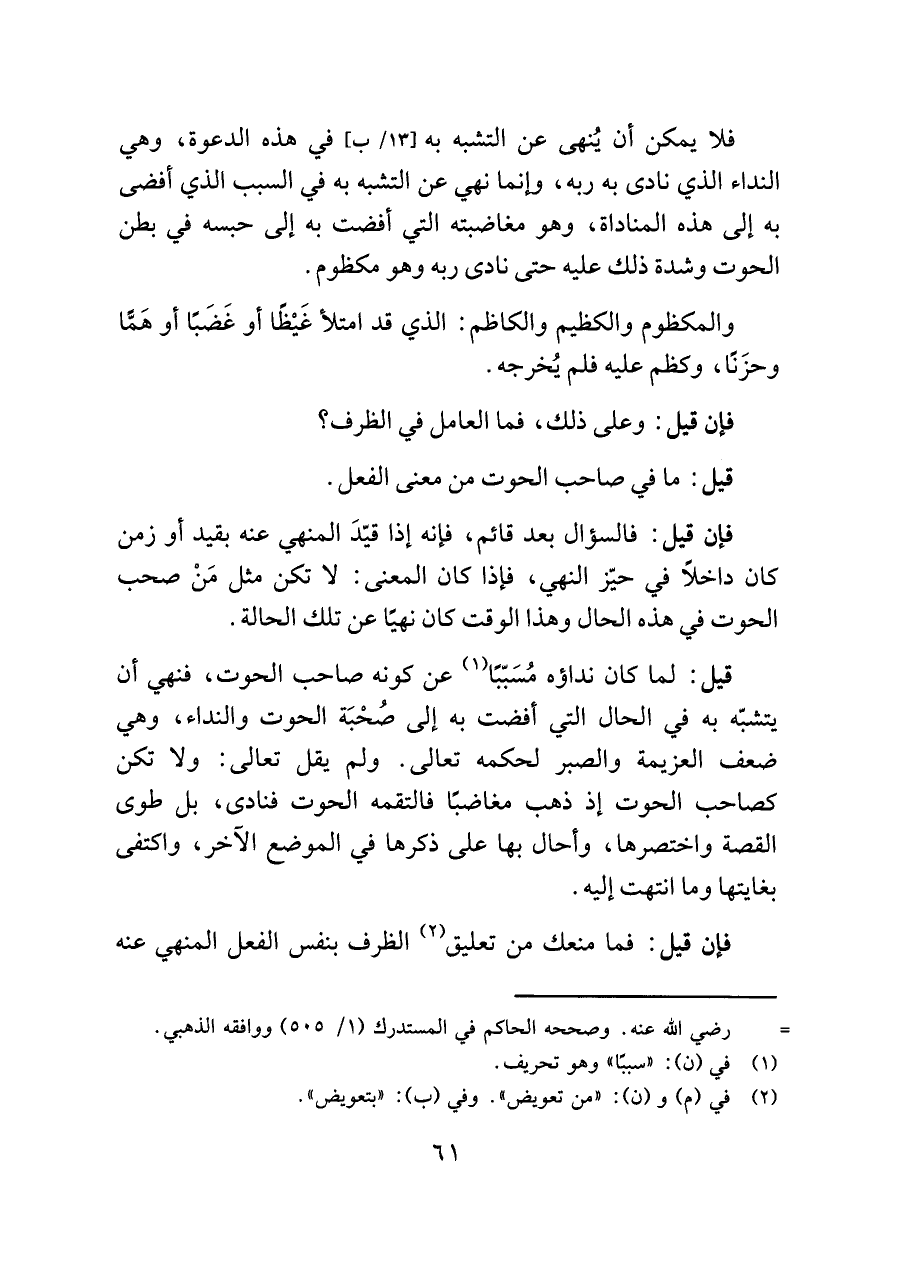 فلا يمكن أن يُنهى عن التشبه به في هذه الدعوة، وهي النداء الذي نادى به ربه، وإنما نهي عن التشبه به في السبب الذي أفضى به إلى هذه المناداة، وهو مغاضبته التي أفضت به إلى حبسه في بطن الحوت وشدة ذلك عليه حتى نادى ربه وهو مكظوم.