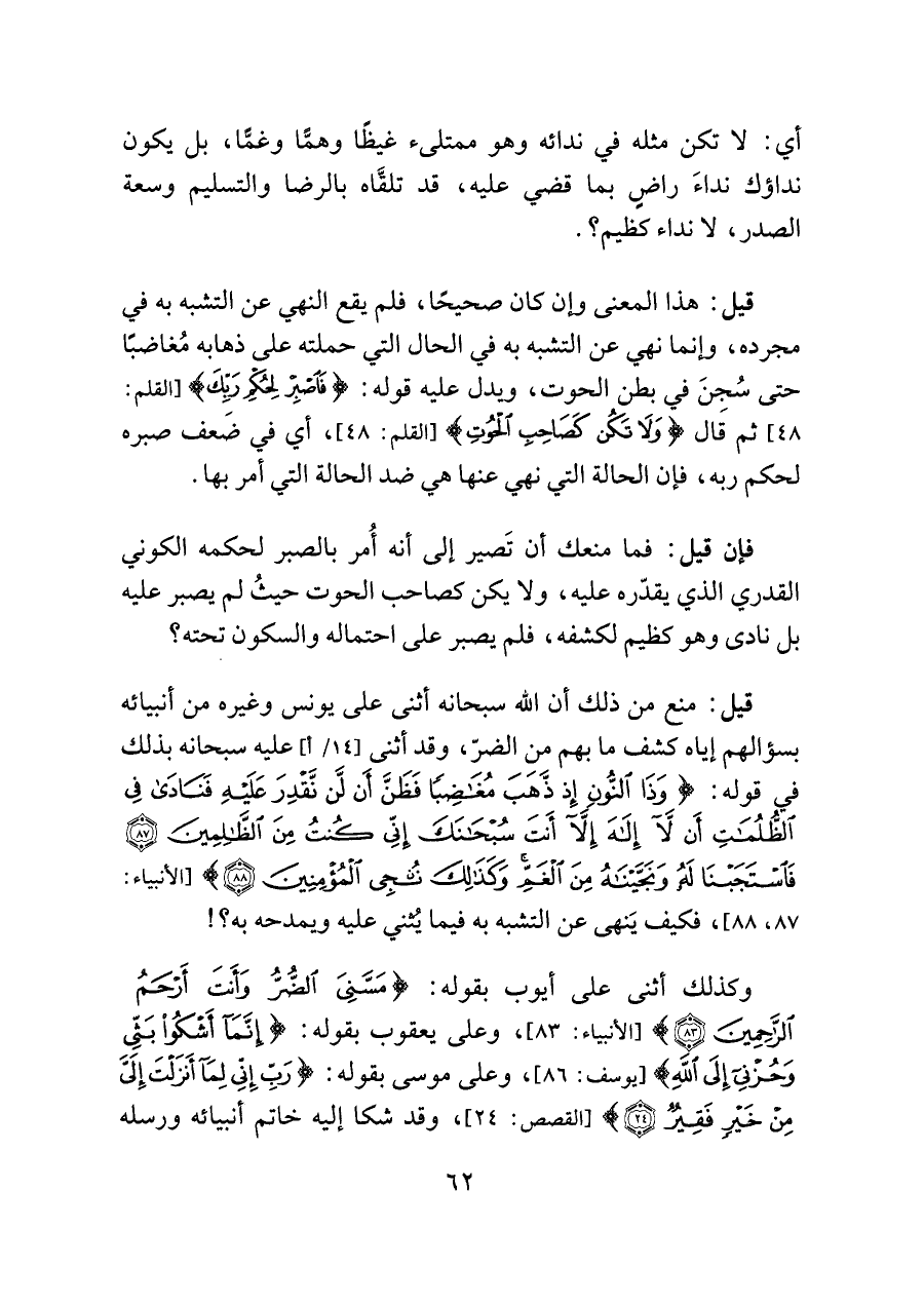 قيل: هذا المعنى وإن كان صحيحًا، فلم يقع النهي عن التشبه به في مجرده، وإنما نهي عن التشبه به في الحال التي حملته على ذهابه مُغاضبًا حتى سُجنَ في بطن الحوت، ويدل عليه قوله: {فَاصْبِرْ لِحُكْمِ رَبِّكَ} [القلم: ٤٨] ثم قَال {وَلَا تَكُنْ كَصَاحِبِ الْحُوتِ} [القلم: ٤٨] أي في ضَعف صبره لحكم ربه، فإن الحالة التي نهي عنها هي ضد الحالة التي أمر بها.