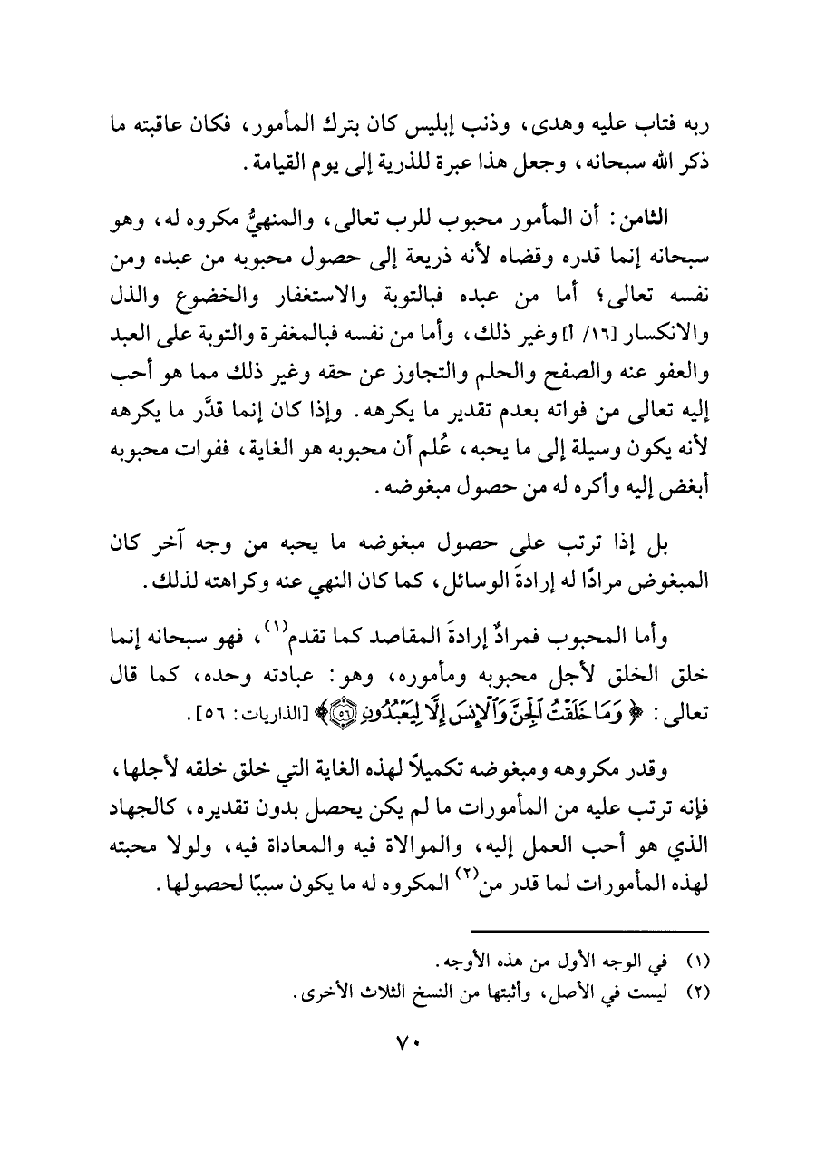 الثامن: أن المأمور محبوب للرب تعالى، والمنهيُّ مكروه له، وهو سبحانه إنما قدره وقضاه لأنه ذريعة إلى حصول محبوبه من عبده ومن نفسه تعالى؛ أما من عبده فبالتوبة والاستغفار والخضوع والذل والانكسار وغير ذلك، وأما من نفسه فبالمغفرة والتوبة على العبد والعفو عنه والصفح والحلم والتجاوز عن حقه وغير ذلك مما هو أحب إليه تعالى من فواته بعدم تقدير ما يكرهه. وإذا كان إنما قدَّر ما يكرهه لأنه يكون وسيلة إلى ما يحبه، عُلم أن محبوبه هو الغاية، ففوات محبوبه أبغض إليه وأكره له من حصول مبغوضه.