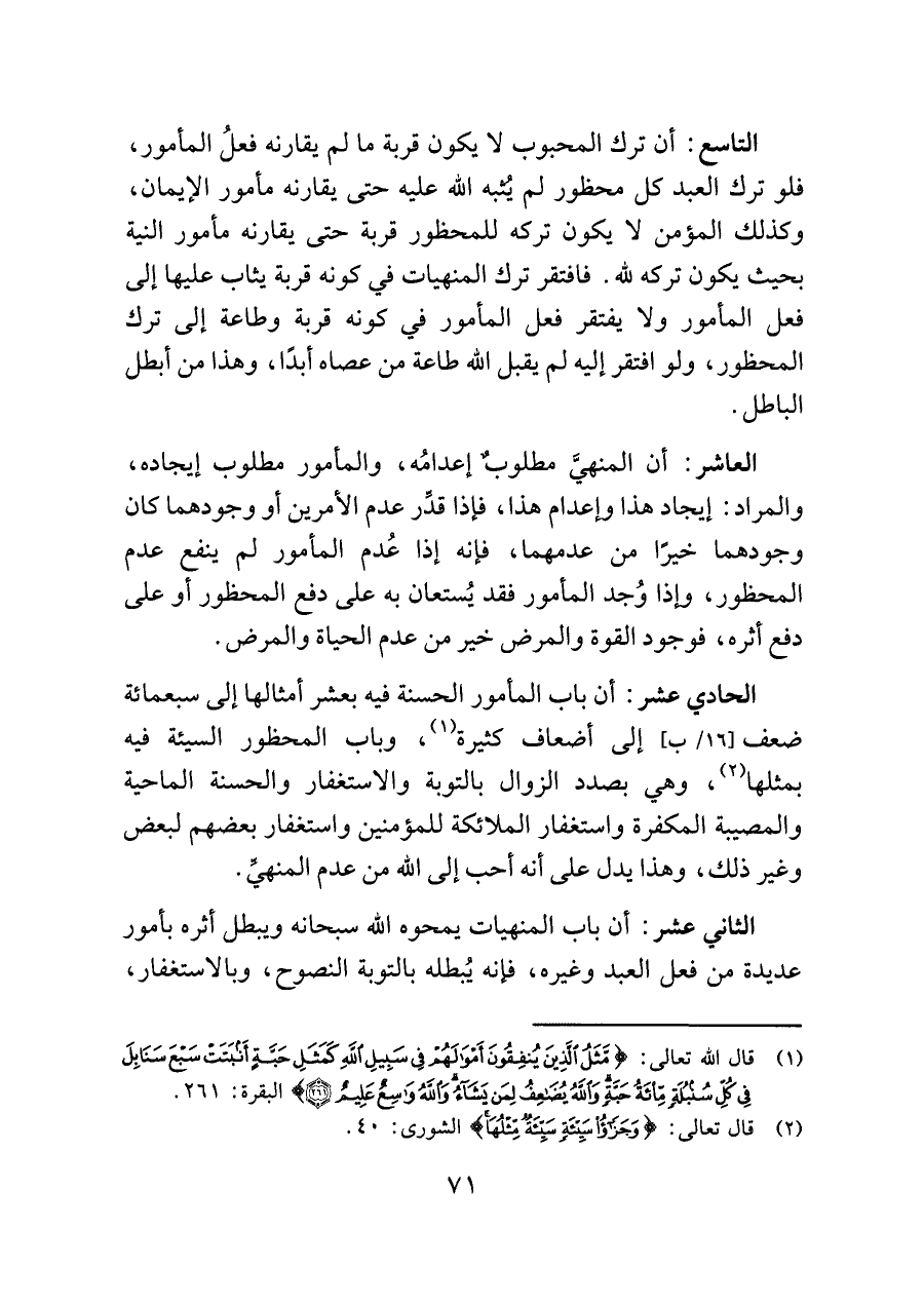 الحادي عشر: أن باب المأمور الحسنة فيه بعشر أمثالها إلى سبعمائة ضعف إلى أضعاف كثيرة (¬١)، وباب المحظور السيئة فيه بمثلها (¬٢)، وهي بصدد الزوال بالتوبة والاستغفار والحسنة الماحية والمصيبة المكفرة واستغفار الملائكة للمؤمنين واستغفار بعضهم لبعض وغير ذلك، وهذا يدل على أنه أحب إلى اللَّه من عدم المنهيِّ.