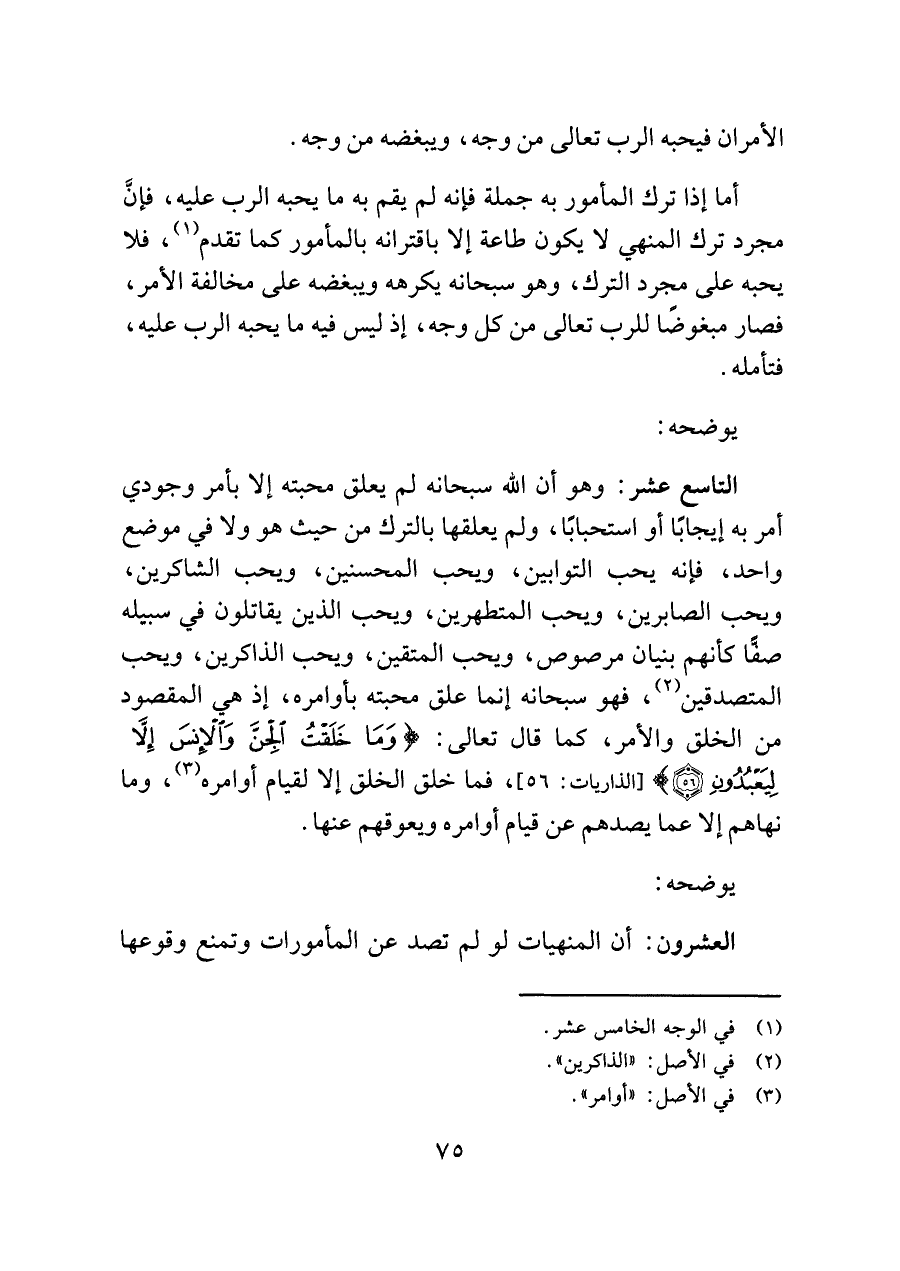 التاسع عشر: وهو أن اللَّه سبحانه لم يعلق محبته إلا بأمر وجودي أمر به إيجابًا أو استحبابًا, ولم يعلقها بالترك من حيث هو ولا في موضع واحد، فإنه يحب التوابين، ويحب المحسنين، ويحب الشاكرين، ويحب الصابرين، ويحب المتطهرين، ويحب الذين يقاتلون في سبيله صفًّا كأنهم بنيان مرصوص، ويحب المتقين، ويحب الذاكرين، ويحب المتصدقين (¬٢)، فهو سبحانه إنما علق محبته بأوامره، إذ هي المقصود من الخلق والأمر، كما قال تعالى: {وَمَا خَلَقْتُ الْجِنَّ وَالْإِنْسَ إِلَّا لِيَعْبُدُونِ (٥٦)} [الذاريات: ٥٦]، فما خلق الخلق إلا لقيام أوامره (¬٣)، وما نهاهم إلا عما يصدهم عن قيام أوامره ويعوقهم عنها.