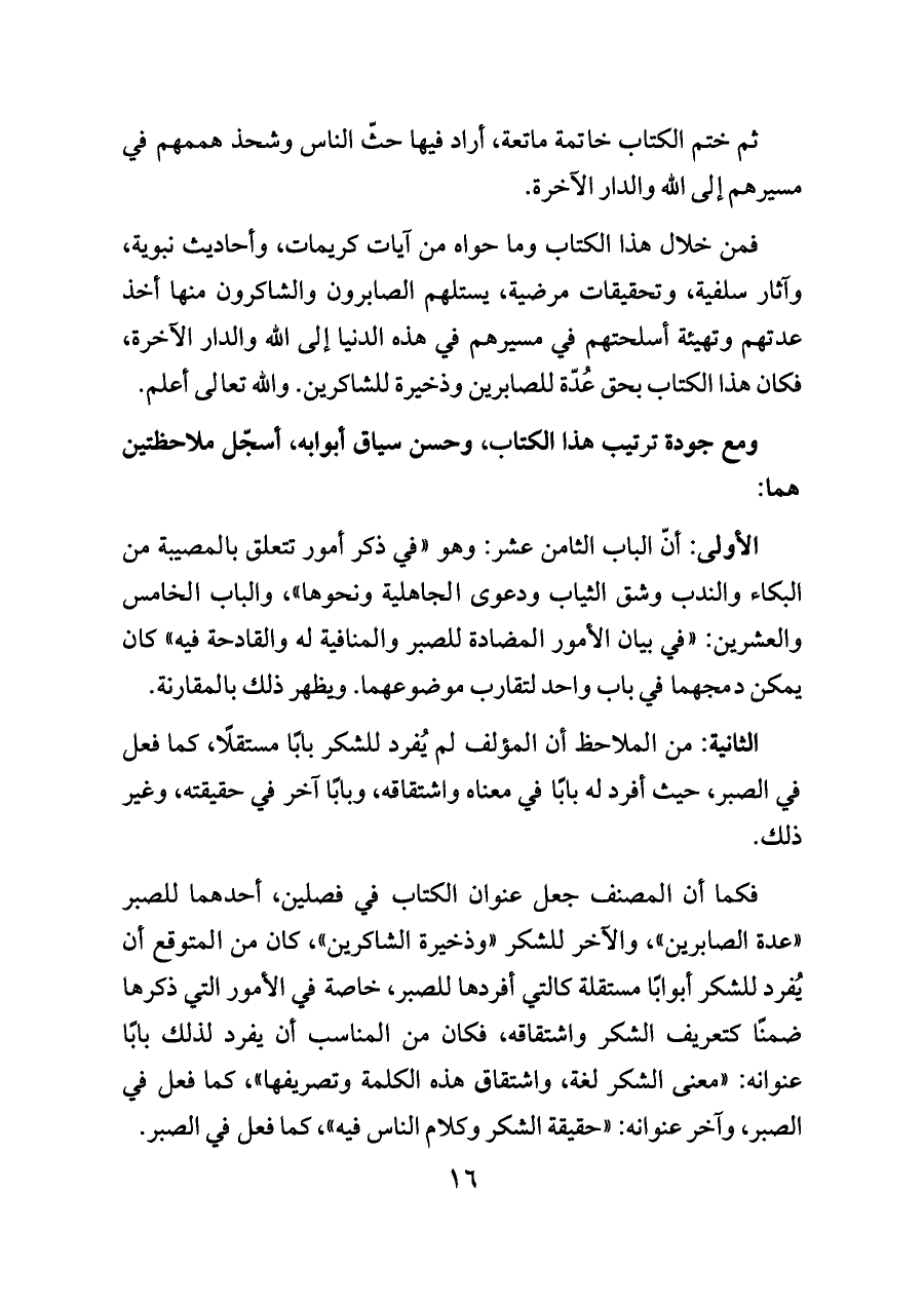 فمن خلال هذا الكتاب وما حواه من آيات كريمات، وأحاديث نبوية، وآثار سلفية، وتحقيقات مرضية، يستلهم الصابرون والشاكرون منها أخذ عدتهم وتهيئة أسلحتهم في مسيرهم في هذه الدنيا إلى اللَّه والدار الآخرة، فكان هذا الكتاب بحق عُدّة للصابرين وذخيرة للشاكرين. واللَّه تعالى أعلم.