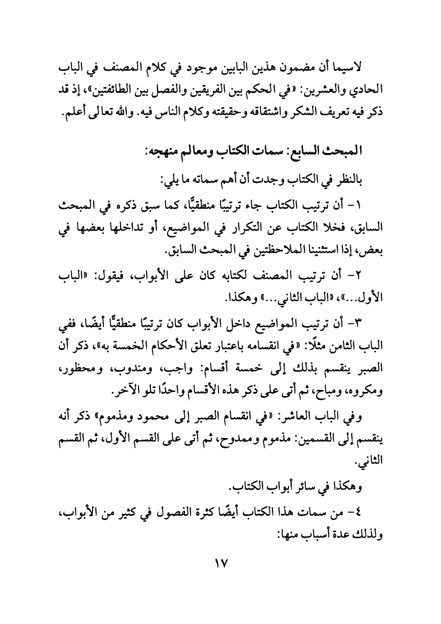 ٣ - أن ترتيب المواضيع داخل الأبواب كان ترتيبًا منطقيًّا أيضًا، ففي الباب الثامن مثلًا: "في انقسامه باعتبار تعلق الأحكام الخمسة به"، ذكر أن الصبر ينقسم بذلك إلى خمسة أقسام: واجب، ومندوب، ومحظور، ومكروه، ومباح، ثم أتى على ذكر هذه الأقسام واحدًا تلو الآخر.