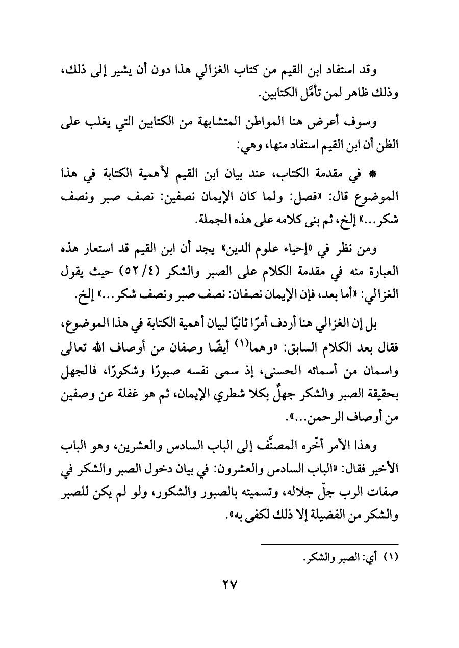 ومن نظر في "إحياء علوم الدين" يجد أن ابن القيم قد استعار هذه العبارة منه في مقدمة الكلام على الصبر والشكر (٤/ ٥٢) حيث يقول الغزالي: "أما بعد، فإن الإيمان نصفان: نصف صبر ونصف شكر. . . " إلخ.