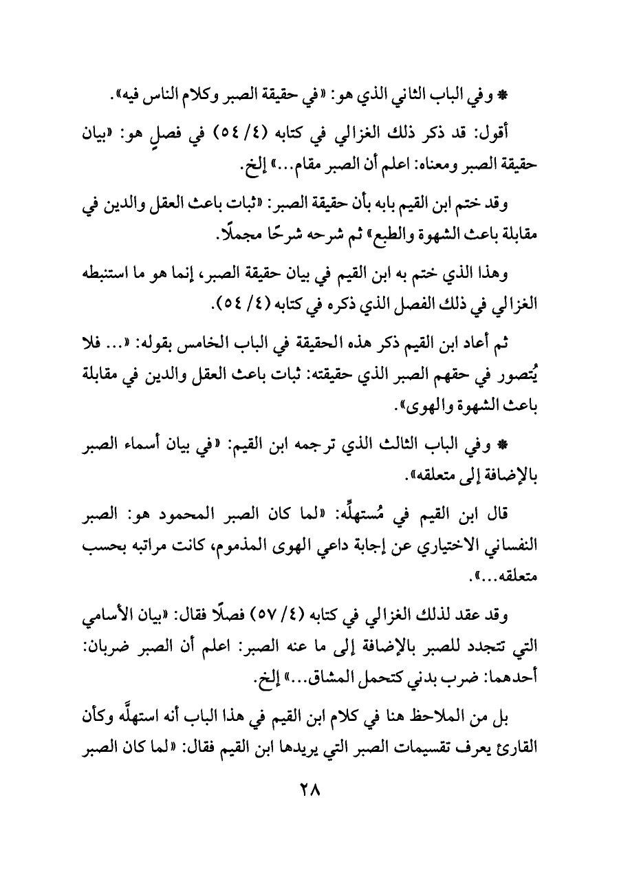 وهذا الذي ختم به ابن القيم في بيان حقيقة الصبر، إنما هو ما استنبطه الغزالي في ذلك الفصل الذي ذكره في كتابه (٤/ ٥٤).