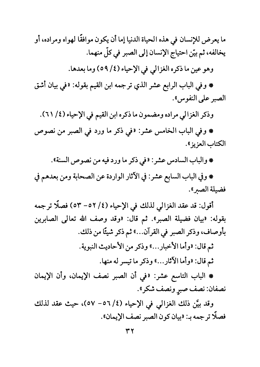 أقول: قد عقد الغزالي لذلك في الإحياء (٤/ ٥٢ - ٥٣) فصلًا ترجمه بقوله: "بيان فضيلة الصبر". ثم قال: "وقد وصف اللَّه تعالى الصابرين بأوصاف، وذكر الصبر في القرآن. . . " ثم ذكر شيئًا من ذلك.