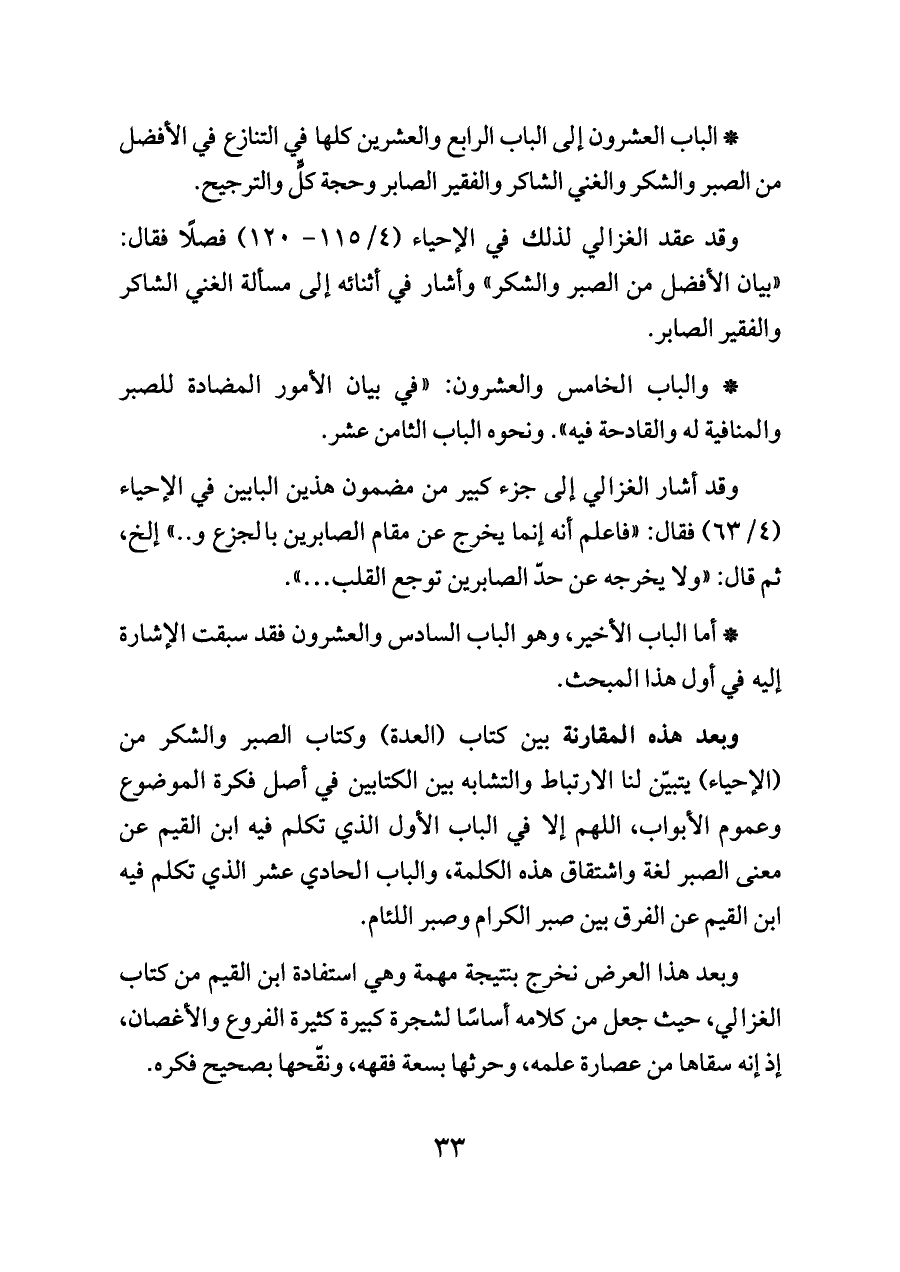 وبعد هذه المقارنة بين كتاب (العدة) وكتاب الصبر والشكر من (الإحياء) يتبيّن لنا الارتباط والتشابه بين الكتابين في أصل فكرة الموضوع وعموم الأبواب، اللهم إلا في الباب الأول الذي تكلم فيه ابن القيم عن معنى الصبر لغة واشتقاق هذه الكلمة، والباب الحادي عشر الذي تكلم فيه ابن القيم عن الفرق بين صبر الكرام وصبر اللئام.