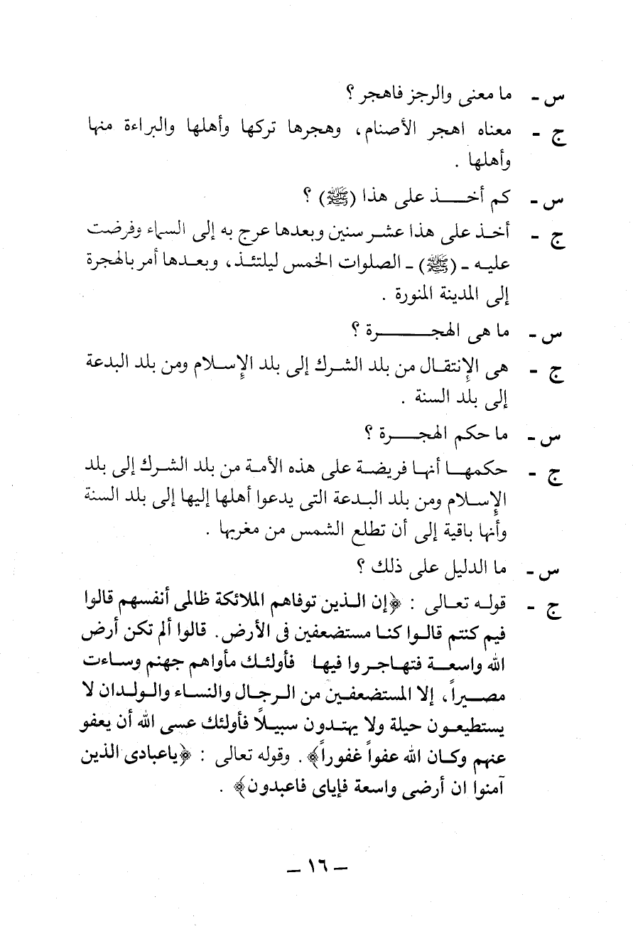 ج: حديث جبريل المشهور عن عمر بن الخطاب رضي الله عنه قال: «بينما نحن جلوس عند النبي صلى الله عليه وسلم إذ طلع علينا رجل شديد بياض الثياب، شديد سواد الشعر، لا يرى عليه أثر السفر، ولا يعرفه منا أحد، فجلس إلى النبي صلى الله عليه وسلم وأسند ركبتيه إلى ركبتيه، ووضع كفيه على فخذيه وقال: يا محمد أخبرني عن الإسلام فقال: أن تشهد أن لا إله إلا الله وأن محمداً رسول الله، وتقيم الصلاة، وتؤتي الزكاة، وتصوم رمضان، وتحج البيت إن استطعت إليه سبيلاً، قال صدقت، فعجبنا له يسأله ويصدقه، قال: أخبرني عن الإيمان، قال " أن تؤمن بالله وملائكته وكتبه ورسله واليوم الآخر وبالقدر خيره وشره " قال: أخبرني عن الإحسان، قال " أن تعبد الله كأنك تراه. فإن لم تكن تراه فإنه يراك " قال: أخبرني عن الساعة؟ قال: