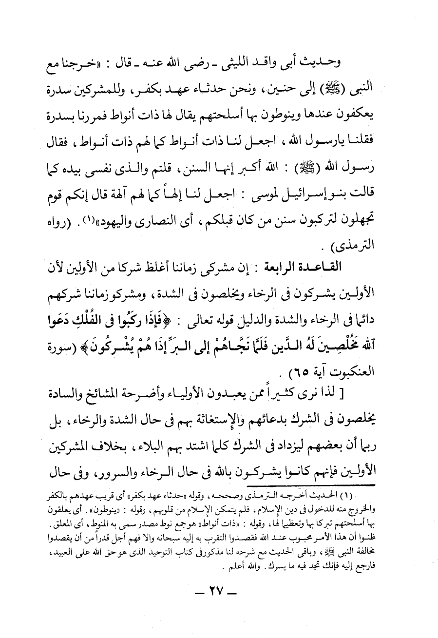 الطهارة (¬1) كما قال تعالى {مَا كَانَ لِلْمُشْرِكِينَ أَنْ يَعْمُرُوا مَسَاجِدَ اللَّهِ شَاهِدِينَ عَلَى أَنْفُسِهِمْ بِالْكُفْرِ أُولَئِكَ حَبِطَتْ أَعْمَالُهُمْ وَفِي النَّارِ هُمْ خَالِدُونَ} [التوبة: 17] (¬2) فإذا عرفت أن الشرك إذا خالط العبادة أفسدها وأحبط العمل وصار صاحبه من الخالدين في النار عرفت أن أهم ما عليك معرفة ذلك لعل الله أن يخلصك وينجيك من هذه الشبكة، وهي الشرك بالله الذي قال الله تعالى فيه: {إِنَّ اللَّهَ لَا يَغْفِرُ أَنْ يُشْرَكَ بِهِ وَيَغْفِرُ مَا دُونَ ذَلِكَ لِمَنْ يَشَاءُ} [النساء: 116] (¬3) وذلك بمعرفة أربع قواعد ذكرها الله تعالى في كتابه.