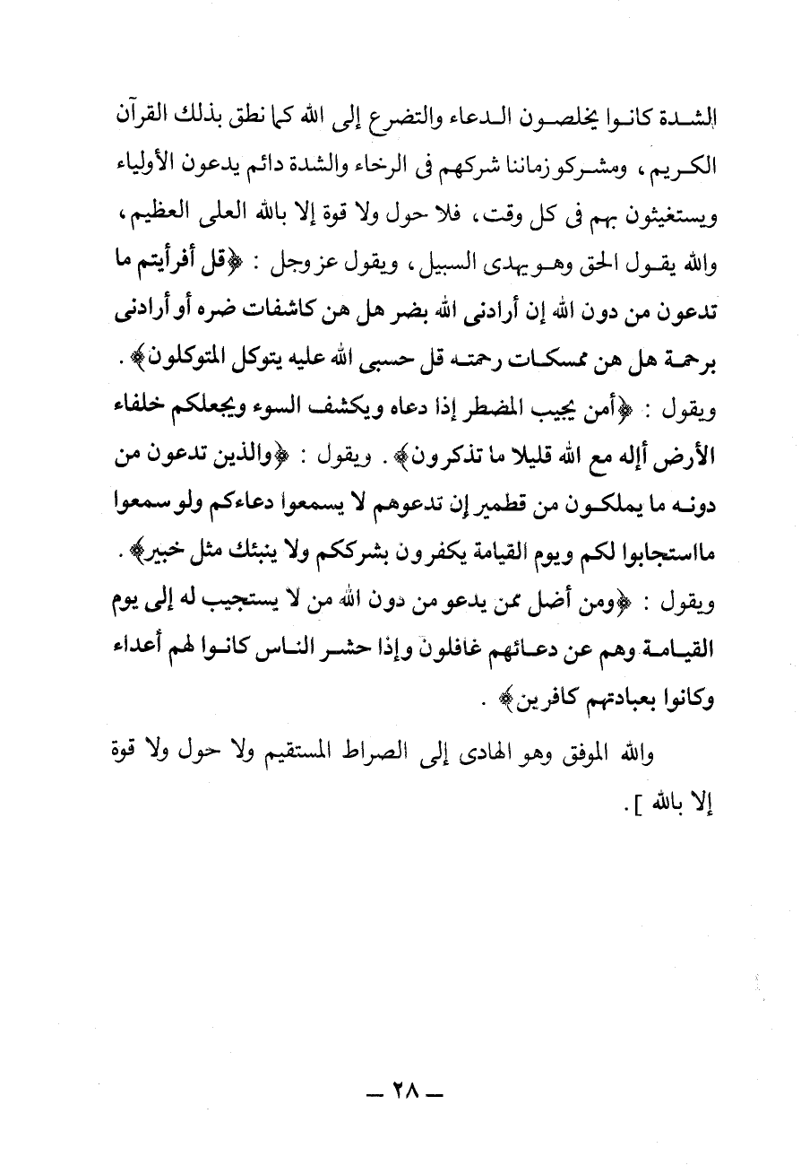 القاعدة الثانية أنهم: أي المشركين يقولون: ما دعوناهم [أي الأولياء] (¬1) وتوجهنا إليهم إلا لطلب القربة والشفاعة، فدليل القربة [أي فدليل أن دعاء الأولياء لقصد أن يقربوهم إلى الله شرك] (¬2) قوله تعالى {وَالَّذِينَ اتَّخَذُوا مِنْ دُونِهِ أَوْلِيَاءَ مَا نَعْبُدُهُمْ إِلَّا لِيُقَرِّبُونَا إِلَى اللَّهِ زُلْفَى إِنَّ اللَّهَ يَحْكُمُ بَيْنَهُمْ فِي مَا هُمْ فِيهِ يَخْتَلِفُونَ إِنَّ اللَّهَ لَا يَهْدِي مَنْ هُوَ كَاذِبٌ كَفَّارٌ} [الزمر: 3] (¬3) ودليل الشفاعة [أي ودليل أن دعاء الأولياء والتوسل بهم لقضاء الحاجات وتفريج الكربات واتخاذهم شفعاء عند الله شرك] (¬4) قوله تعالى {وَيَعْبُدُونَ مِنْ دُونِ اللَّهِ مَا لَا يَضُرُّهُمْ وَلَا يَنْفَعُهُمْ وَيَقُولُونَ هَؤُلَاءِ شُفَعَاؤُنَا عِنْدَ اللَّهِ قُلْ أَتُنَبِّئُونَ اللَّهَ بِمَا لَا يَعْلَمُ فِي السَّمَاوَاتِ وَلَا فِي الْأَرْضِ سُبْحَانَهُ وَتَعَالَى عَمَّا يُشْرِكُونَ} [يونس: 18] (¬5) والشفاعة شفاعتان، شفاعة منفية، وشفاعة مثبتة، فالشفاعة المنفية ما كانت تطلب من غير الله فيما لا يقدر عليه إلا الله، والدليل قوله تعالى: {يَا أَيُّهَا الَّذِينَ آمَنُوا أَنْفِقُوا مِمَّا رَزَقْنَاكُمْ مِنْ قَبْلِ أَنْ يَأْتِيَ يَوْمٌ لَا بَيْعٌ فِيهِ وَلَا خُلَّةٌ وَلَا شَفَاعَةٌ وَالْكَافِرُونَ هُمُ الظَّالِمُونَ} [البقرة: 254]