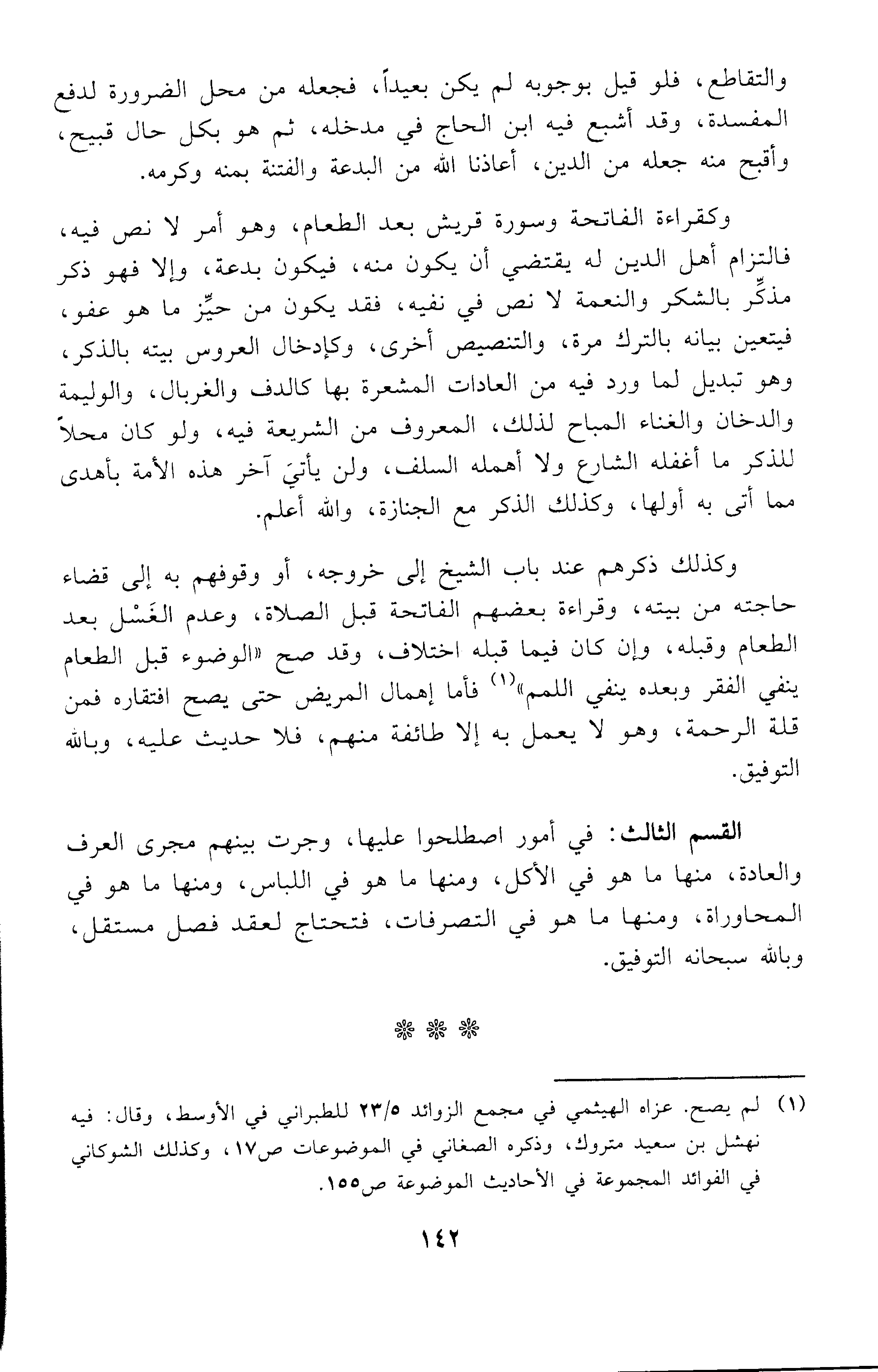 ومن ذلك اشتراطهم الزيارة (¬1) على المريد، وأنه مع إخوانه مساو لهم في الحال وغيره، وهو شيء يجر إلى أكل الحرام النص، فإن النفوس مهجبولة على حب الخير، واستحسان ما يذكر بالحسن فتأتي لذلك، وتدخل فيه، مع حب الدنيا، فلا يمكنها إلا الإسعاف مصحوبا بالتكلف، وقد قال (ص): "أنا وأتقياء أمتي برآء من التكلف" (¬2) وقد انجر بعض الناس إلى المنافسة فوقعوا في خلاف المقصود، وصار يؤذي بعضهم بعضا بالمعايير، ويقولون: ذوي فلان (¬3) مثل ثيران الحرث، لا يأتون بشيء، ويريدون العلف والتلف، إلى غير ذلك، وهذا أمر محرم إجماعا، وأعظم من ذلك استنادهم إلى قوله تعالى: