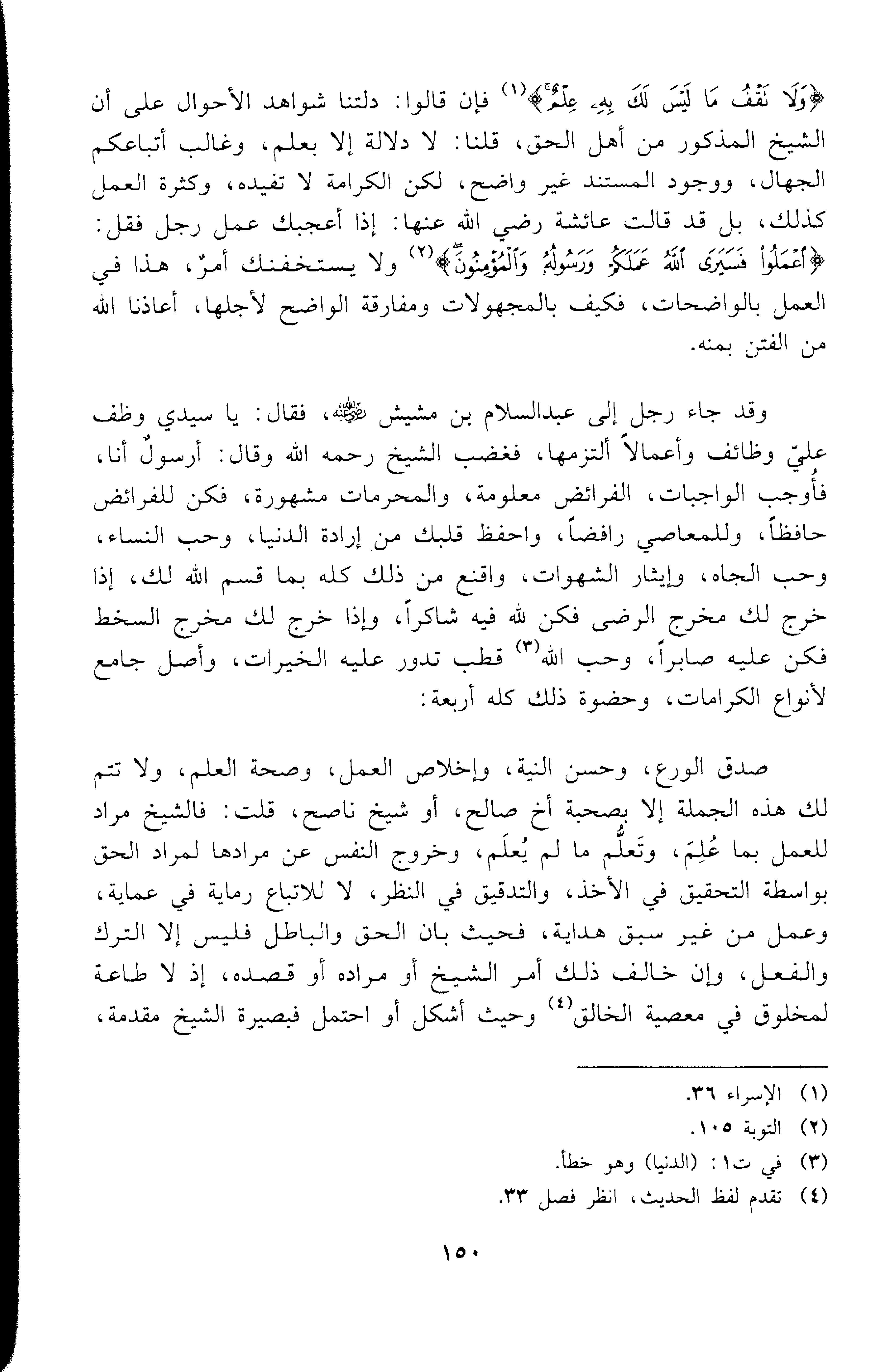 وقال الجنيد (ض): علمنا هذا مقيد بالكتاب والسنة، فمن لم يسمع الحديث ويجالس الفقهاء، ويأخذ أدبه من المتأدبين، أفسد من اتبعه، وقال في حكم ابن عطاء الله (ض): لا تصحب من لا ينهضك حاله، ولا يدلك على الله مقاله، ربما كنت مسيئا فأراك الإحسان منك صحبتك إلى من هو أسوأ حالا منك انتهى، وإليه أشار بقوله: ولأن تصحب جاهلا لا يرضى عن نفسه خير لك من أن تصحب عالما يرضى عن نفسه.