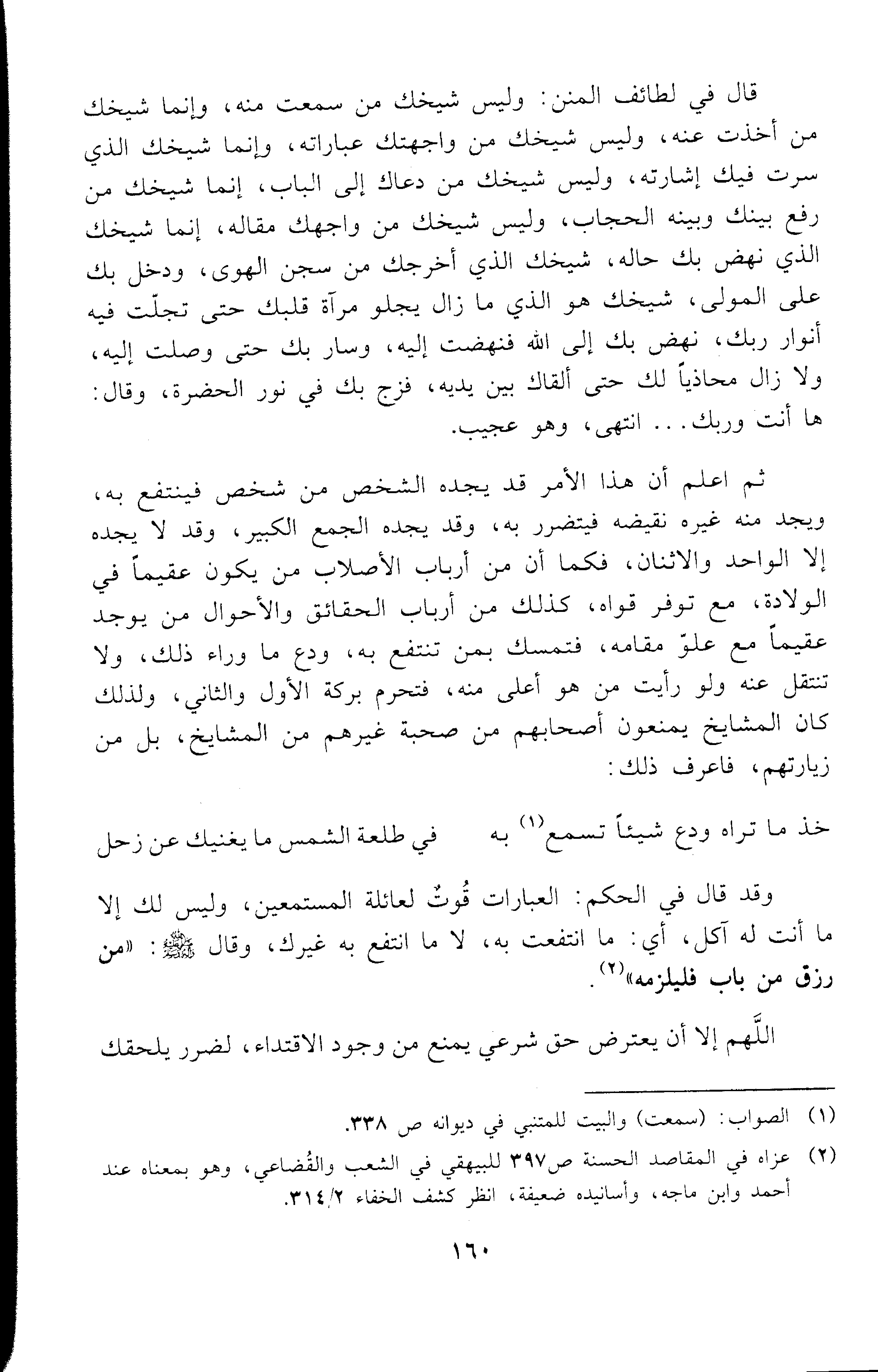 (¬2) الاعتقاد بمعنى الرضا عن حالة الشيخ والتسليم وعدم الانتقاد، محله كما يأتي للمؤلف في آخر هذا الفصل بعد اختبار مرتبته من الدين، حيث يصف المؤلف من يغتر بكل من يراه دون اختبار مرتبته من الدين بأنه أعظم جهلا ... إلخ، وانظر فيما تقدم هامش 332.