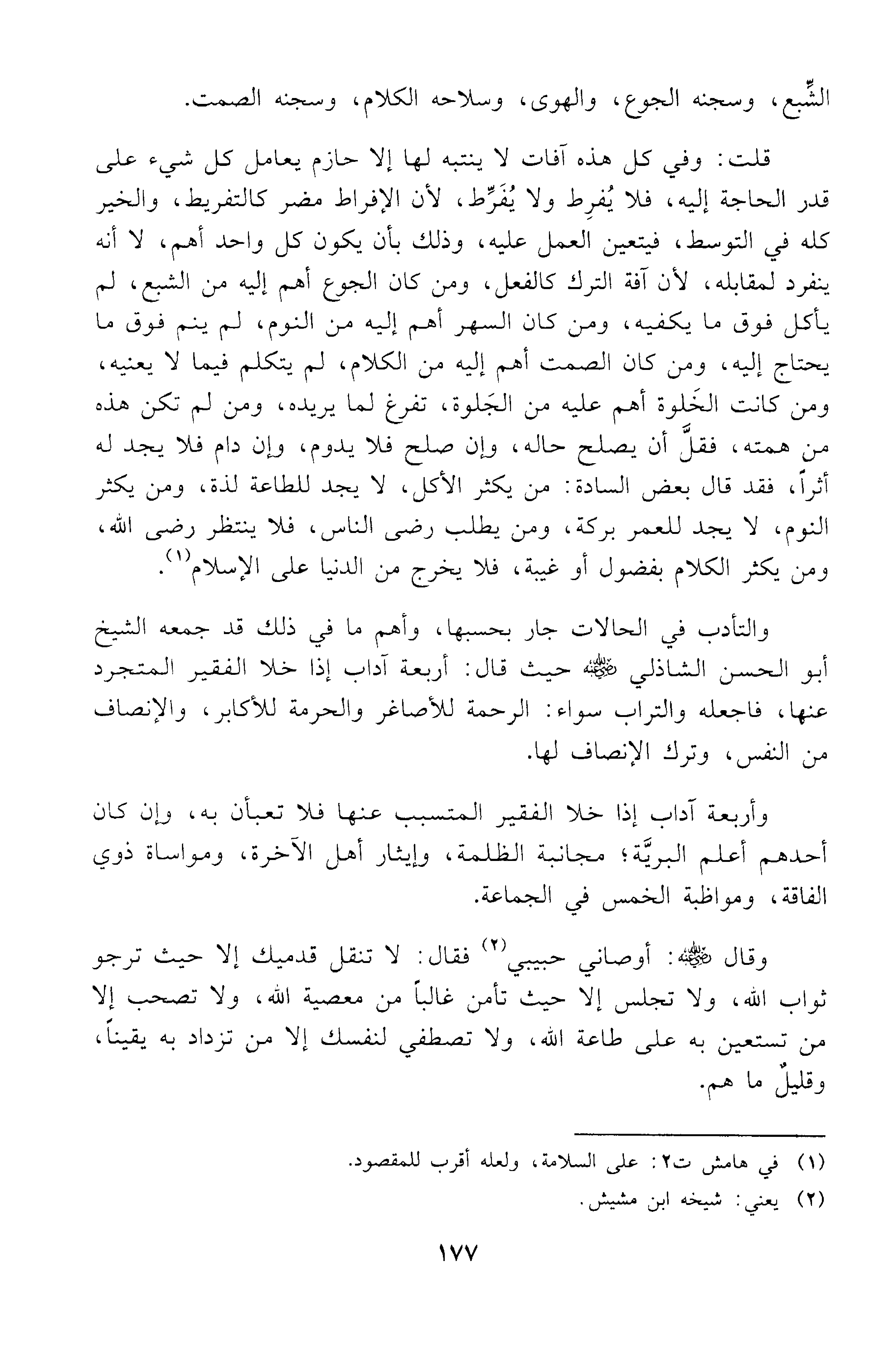 وقال (ض): أوصاني أستاذي رحمه الله فقال: الله الله والناس، نزه لسانك عنهم، وقلبك عن التماثيل من قبلهم، وعليك بحفظ الجوارح وأداء الفرائض، وقد تمت ولاية الله عندك، فلا تذكرهم إلا بواجب حق الله عليك، وقد تم ورعك، وقل: اللهم أرحني من ذكرهم، ومن العوارض من قبلهم، ونجني من شرهم، واغنني بخيرك عن خيرهم، وتولني بالخصوصية من بينهم، إنك على كل شيء قدير انتهى، وهو عجيب، وكذا كل ما قبله، وهي جملة جامعة لوجوه الآداب وأصول التحقق في رفع الهمة، فتمسك بها حتى يأتيك الفتح من الله مجردا عن الوسائط، أو بواسطة ولي من أوليائه، وهو أتم لمن قضي له به، وبالله سبحانه التوفيق، وهو حسبنا ونعم الوكيل.