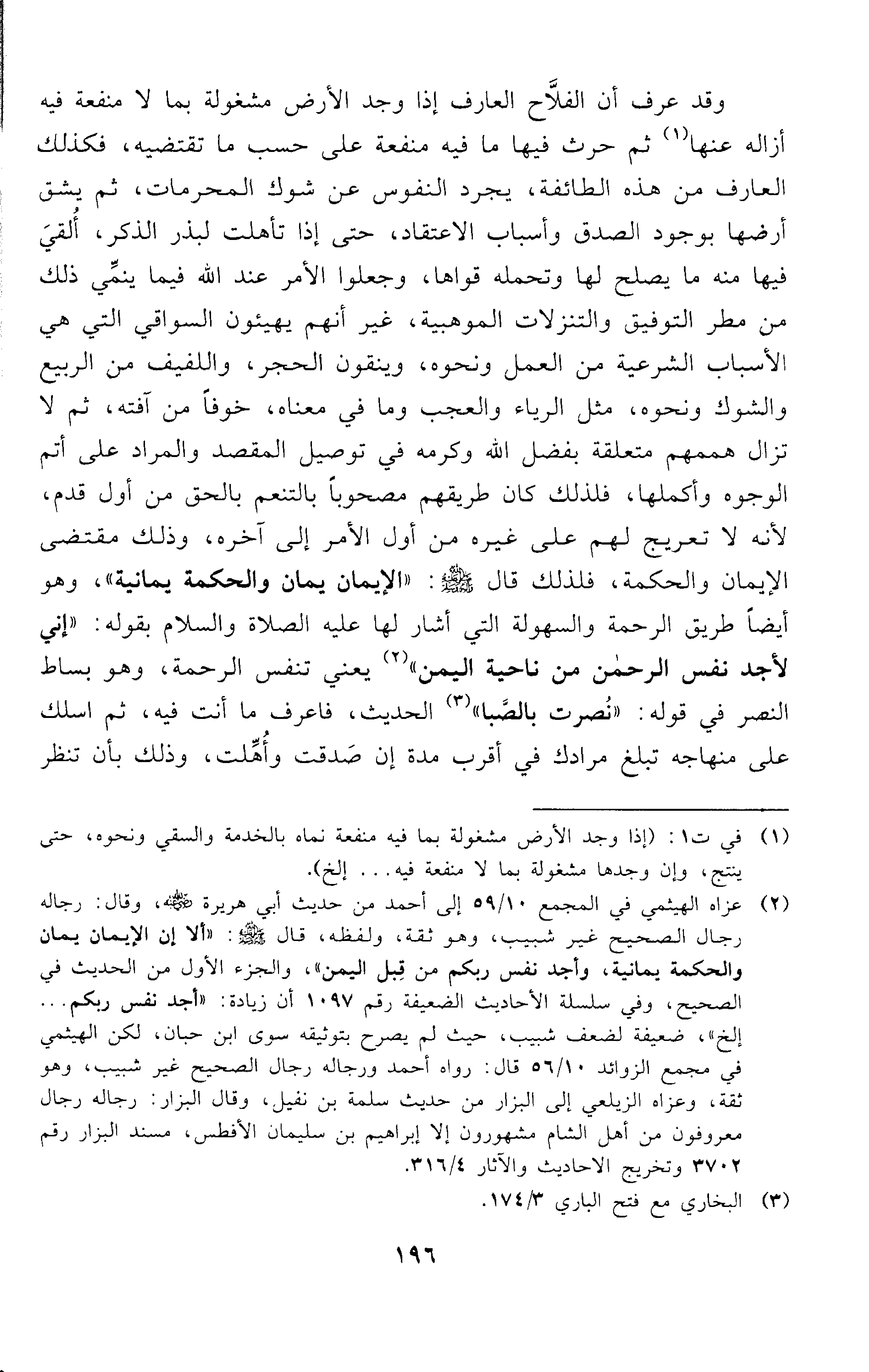 بخسة نفسه، وضعتها وعيوبها وآفاتها، فإذا أحاط علما بهذين الأصلين نظر إلى نفسه وإلى ما أجرى الحق تعالى عليه من الأفعال والأقوال، وما صرفه فيه من الأحوال، فسيرى حينئذ من لطف الله تعالى به ورحمته وعنايته وفضله ما لا مطمع لأحد في إدراكه وفهمه، فيوجب ذلك له محبة وحياء يحملانه على الشكر لله تعالى بشهود النعم منه وحسن الأدب معه، فإذا رأى نفسه على طاعة فرح بمنة الله تعالى عليه من غير استحقاق ولا وسيلة، وكم من شخص لم يعطها، وليستعمل حينئذ حسن الأدب في تحسينها ونفي الآفات عنها وإخلاصه فيها ربه عز وجل، فيكون حينئذ بهذه الرؤية والأدب أفضل ممن استغرق أوقاته في الطاعات وأنواع العبادات، مع فقدان ذلك، وكذلك إن رأى نفسه بحال نعمة، من صحة بدن ونيل رزق وإن قل، فليفرح بذلك ويشكر ربه عليه لعلمه أنه لا يستأهل ذلك ولا يليق به، ويستعمل حينئذ حسن الأدب في الاستعانة بها على طاعة الله عز وجل، ولا يستعملها في معصية، وكم من شخص مبتلى بمرض أو فقر يتمنى ذلك ولا يجده، وكذلك إذا ابتلي بفقر أو أصيب بمرض من مصائب الدنيا فليفرح بذلك، لأنه سلك به مسلك الأولياء والصالحين، وليفرح بمنة ربه عز وجل في أن لم تكن أكثر من ذلك، كما ابتلي به طوائف من الناس، وليستعمل حسن الأدب في الصبر والرضى ونفي الجزع والشكوى، والدعاء إلى الله تعالى في سعة الرزق وكشف الضر وسؤال العافية في الدين والدنيا، وإن أمكنه السبب لاكتساب ما يغنيه والتطبب لبرئه، فيفعل ذلك فهو من حسن الأدب، وليشكر الله تعالى على تمكينه من ذلك وإذنه له فيه، وكذلك إن ابتلي بذنب أو غفلة أو سوء أدب فلا يغفل عن اللطف وخفي السنة بذلك، فقد يكون ذلك سببا لخوفه ونفي عجبه والتجائه ربه، كما ورد في الخبر في قوله (ص): ((لو لم تذنبوا لخشيت عليكم ما هو أشد من ذلك العجب)) (¬1) وكم نت شخص مرتكب للكبائر مستحل لها، فرح بها.