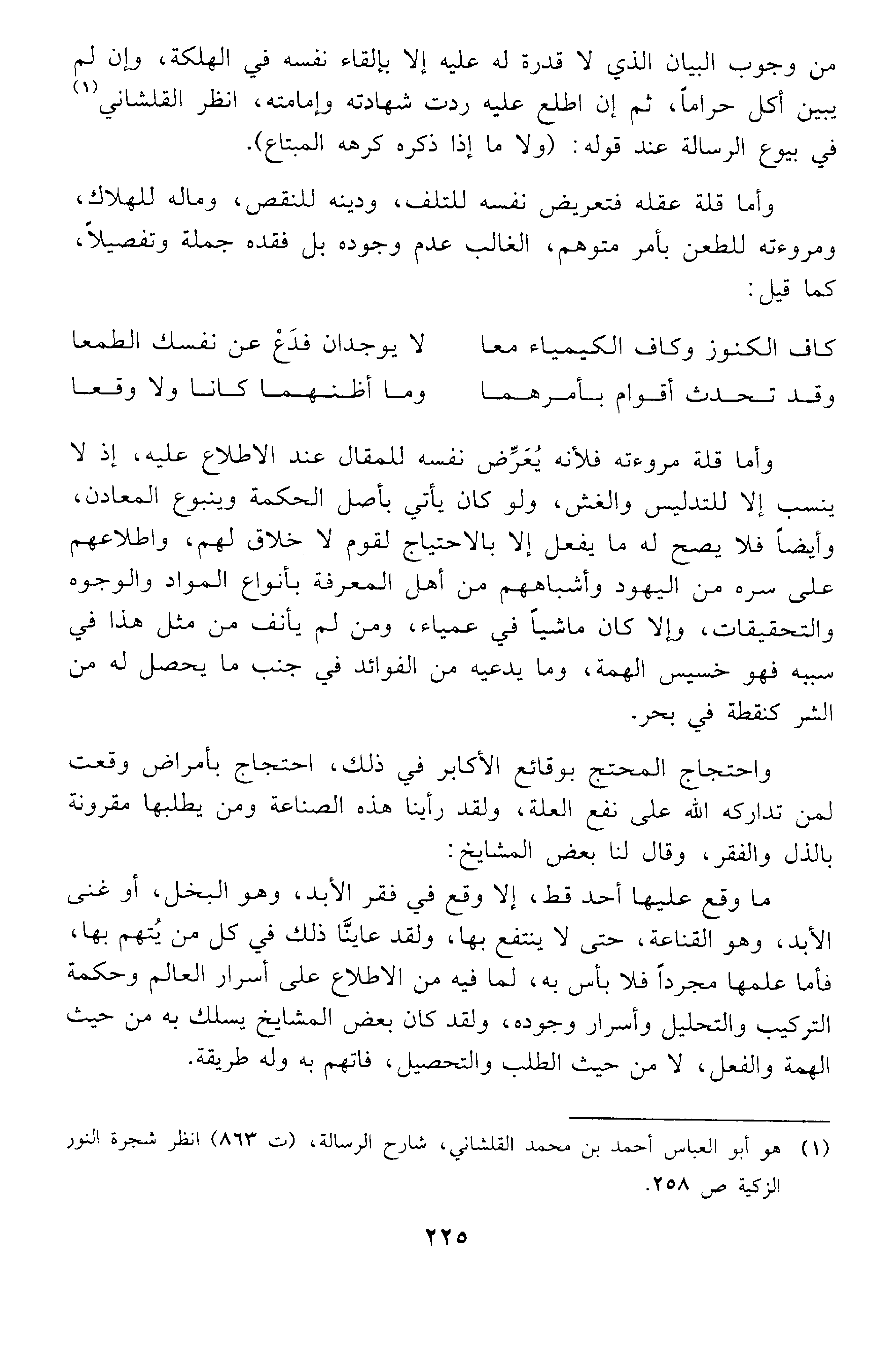 حروفها، وكتبها بغير ما يحل من دم ونحوه، أو إذاية بعض الحيوانات، كالخنفطرات (¬1) المبنية على رماد الخطاف وغيرها، الموقوفة على دم الحمام وزرقه، وقد يكون من باب التوغل في الأسباب القادحة في التوكل، كما أشار إليه الشيخ ابن عباد في مسألة الخاتم الوبائي (¬2) أعني حي، حميد، حنان، حليم، إلى غير ذلك، مع أنه شغل وقت بما غالبه غير نافذ، ولا مظنون النفوذ، وربما هلك فيه مستعمله، كما اتفق لكثير من أهله، لعدم علمه، وفقد مساعدة قواه عليه، فإن الخاصية التي يقع عليها الانفعال مركبة من صفة نفسية، وحقيقة قلبية، وحركة عملية (¬3) كالمغناطيس للحديد، لا يجذب غيره ولا يتأخر عنه، وقد قال علماء الفن: لا ينتفع أحد به إلا عالم يعرف حقائق ما يتحرك فيه، أو جاهل يعظم في نفسه ما يتوهمه من قوته، فلذلك لا ينتفع عالم بمجهود، ولا جاهل بواضح، بل بمبهمات، قالوا: