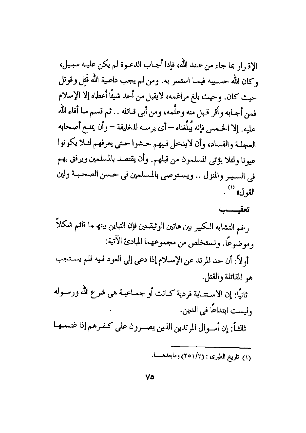 الإقرار بما جاء من عند الله، فإذا أجاب الدعوة لم يكن عليه سبيل، وكان الله حسيبه فيما استسر به، ومن لم يجب داعية الله قَتِل وقوتل حيث كان، وحيث بلغ مراغمه، لا يقبل من أحد شيئاً أعطاه إلا الإسلام فمن أجابه وأقر قبل منه وعلَّمه، ومن أبى قاتله.... ثم قسم ما أفاء الله عليه. إلا الخمس فإنه يُبلَّغاه - اي يرله للخليفة - وأن يمنع أصحابه العجلة والفساد، وأن لا يدخل فيهم حشوا حتى يعرفهم لئلا يكونوا عيوناً ولئلا يؤتى المسلمون من قبلهم. وأن يقتصد بالمسلمين ويرفق بهم في السير والمنزل ... ويستوصى بالمسلمين في حسن الصحبة ولين القول".