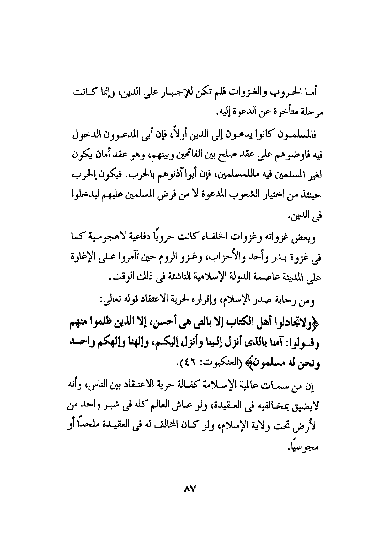 أما الحروب والغزوات فلم تكن للإجبار على الدين، وإنما كانت مرحلة متأخرة عن الدعوة إليه.