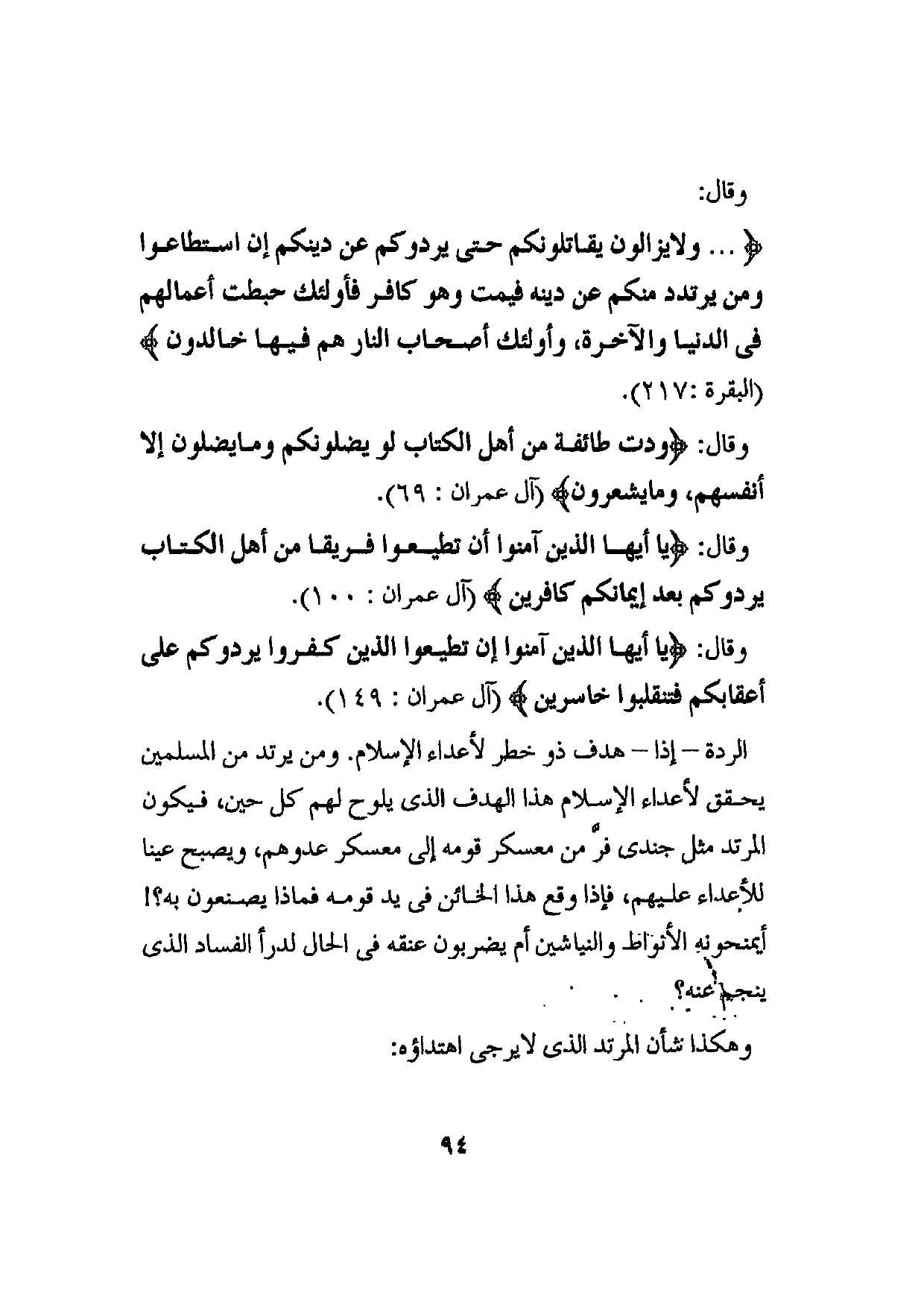 {.... وَلَا يَزَالُونَ يُقَاتِلُونَكُمْ حَتَّى يَرُدُّوكُمْ عَنْ دِينِكُمْ إِنِ اسْتَطَاعُوا وَمَنْ يَرْتَدِدْ مِنْكُمْ عَنْ دِينِهِ فَيَمُتْ وَهُوَ كَافِرٌ فَأُولَئِكَ حَبِطَتْ أَعْمَالُهُمْ فِي الدُّنْيَا وَالْآخِرَةِ وَأُولَئِكَ أَصْحَابُ النَّارِ هُمْ فِيهَا خَالِدُونَ} (البقرة: 217) .