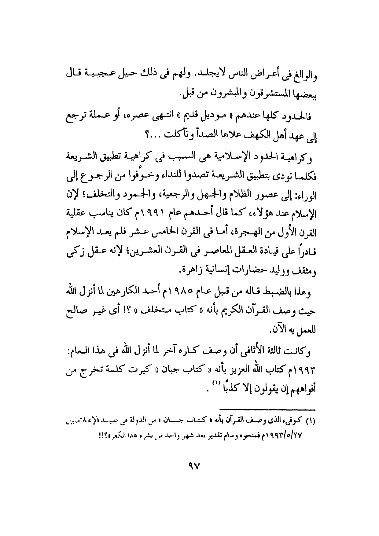 وكانت ثالثة الأثافى أن وصف كاره آخر لما أنزل الله في هذا العام: 1993م كتاب الله العزيز بأنه "كتاب جبان" كبرت كلمة تخرج من أفواههم إن يقولون إلا كذباً.