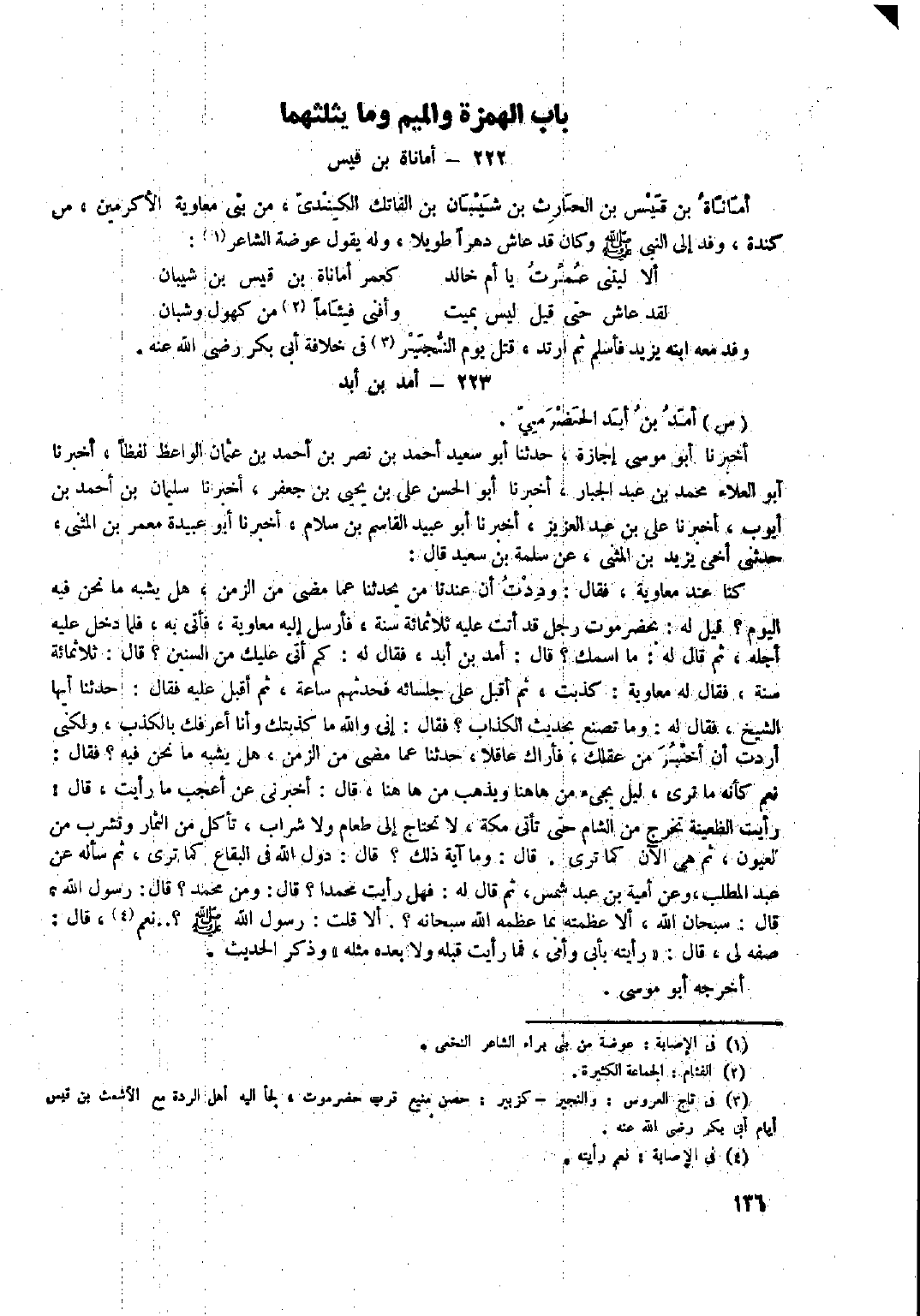 كُنَّا عِنْدَ مُعَاوِيَةَ، فَقَالَ: وَدَدْتُ أَنَّ عِنْدَنَا مَنْ يُحَدِّثُنَا عَمَّا مَضَى مِنَ الزَّمَنِ، هَلْ يُشْبِهُ ما نحن فيه اليوم؟ قيل له: بحضر موت رَجُلٌ قَدْ أَتَتْ عَلَيْهِ ثَلاثُمِائَةٍ سَنَةٍ، فَأَرْسَلَ إِلَيْهِ مُعَاوِيَةُ، فَأَتَى بِهِ، فَلَمَّا دَخَلَ عَلَيْهِ أَجَّلَهُ، ثُمَّ قَالَ لَهُ: مَا اسْمُكَ؟ قَالَ: أَمَدُ بْنُ أَبَدٍ، فَقَالَ لَهُ: كَمْ أَتَى عَلَيْكَ مِنَ السِّنِينَ؟ قَالَ: ثَلاثُمِائَةِ سَنَةٍ، فَقَالَ لَهُ مُعَاوِيَةُ: كَذَبْتَ، ثُمَّ أَقْبَلَ عَلَى جُلَسَائِهِ فَحَدَّثَهُمْ سَاعَةً، ثُمَّ أَقْبَلَ عَلَيْهِ فَقَالَ: حَدِّثْنَا أَيُّهَا الشَّيْخُ، فَقَالَ لَهُ: وَمَا تَصْنَعُ بِحَدِيثِ الْكَذَّابِ؟ فَقَالَ: إِنِّي وَاللَّهِ مَا كَذَّبْتُكَ وَأَنَا أَعْرِفُكَ بِالْكَذِبِ، وَلَكِنِّي أَرَدْتُ أَنْ أُخْبِرَ مِنْ عَقْلِكَ، فَأَرَاكَ عَاقِلا، حَدِّثْنَا عَمَّا مَضَى مِنَ الزَّمَنِ، هَلْ يُشْبِهُ مَا نَحْنُ فِيهِ؟ فَقَالَ: