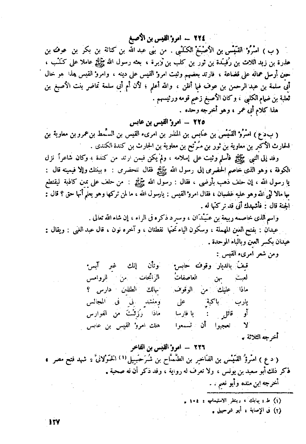 (ب) امرؤ القيس بْن الأصبغ الكلبي. من بني عَبْد اللَّهِ بْن كنانة بْن بَكْر بْن عوف بْن عذرة بْن زَيْد اللات بْن رفيدة بْن ثور بْن كلب بْن وبرة، بعثه رَسُول اللَّهِ صَلَّى اللَّهُ عَلَيْهِ وَسَلَّمَ عاملًا عَلَى كلب، حين أرسل عماله عَلَى قضاعة، فارتد بعضهم وثبت امرؤ القيس عَلَى دينه، وامرؤ القيس هذا هو خال أبي سلمة بن عبد الرحمن بن عوف فيما أظن، والله أعلم، لأن أم أَبِي سلمة تماضر بنت الأصبغ بْن ثعلبة بْن ضمام الكلبي، وكان الأصبغ زعيم قومه ورئيسهم.