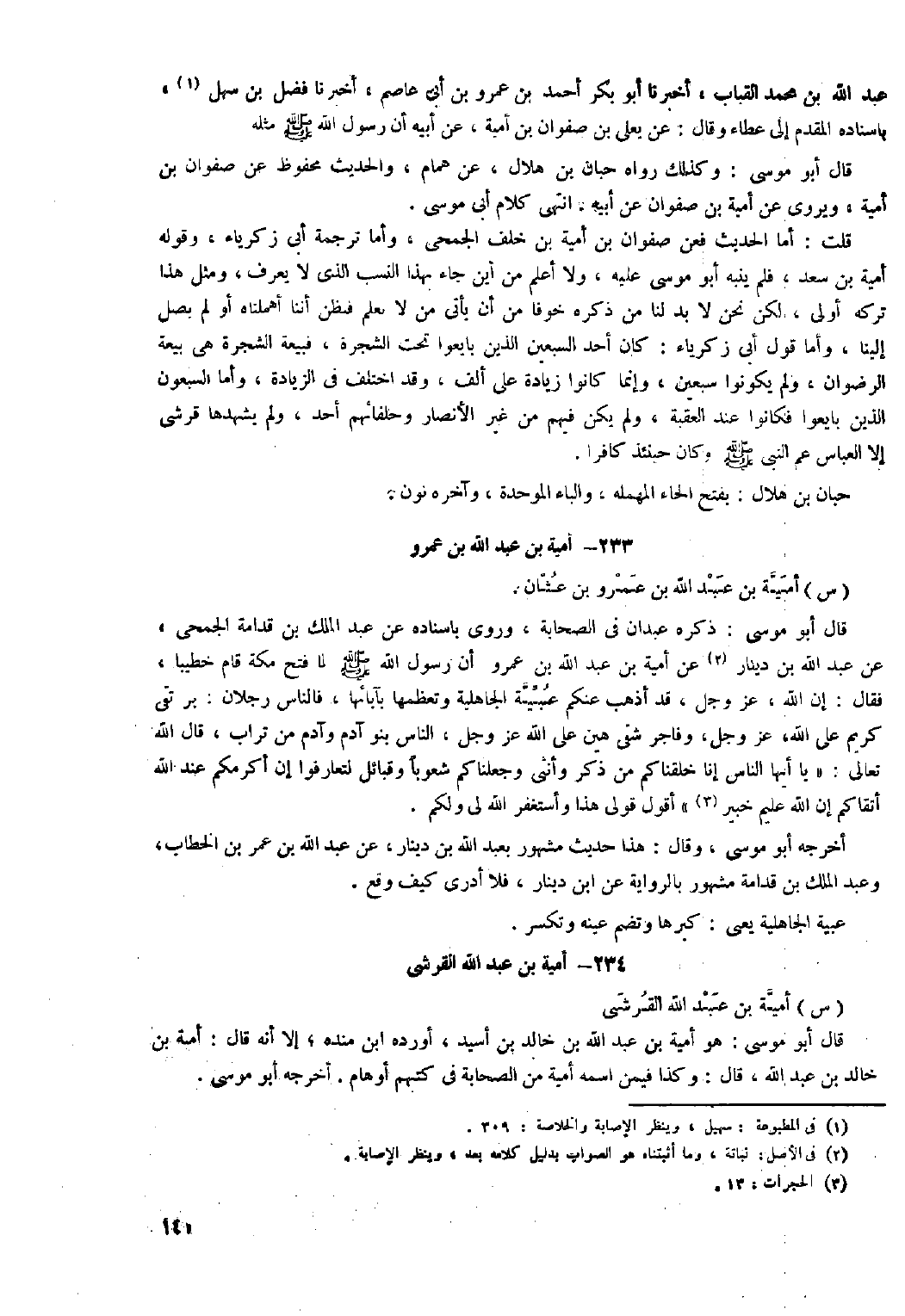عَبْدُ اللَّهِ بْنُ مُحَمَّدٍ الْقَبَّابُ، أَخْبَرَنَا أَبُو بكر أَحْمَدُ بْنُ عَمْرِو بْنِ أَبِي عَاصِمٍ، أَخْبَرَنَا فَضْلُ بْنُ سَهْلٍ [١] ، بِإِسْنَادِهِ الْمُقَدَّمِ إِلَى عَطَاءٍ وَقَالَ: عَنْ يَعْلَى بْنِ صَفْوَانَ بْنِ أُمَيَّةَ، عَنْ أَبِيهِ أَنَّ رَسُولَ اللَّهِ صَلَّى اللَّهُ عَلَيْهِ وَسَلَّمَ مِثْلَهُ قَالَ أَبُو مُوسَى: وَكَذَلِكَ رَوَاهُ حِبَّانُ بْنُ هِلالٍ، عَنْ هَمَّامٍ، وَالْحَدِيثُ مَحْفُوظٌ عَنْ صَفْوَانَ بْنِ أُمَيَّةَ، وَيُرْوَى عَنْ أُمَيَّةَ بْنِ صَفْوَانَ عَنْ أَبِيهِ. انْتَهَى كَلامُ أَبِي مُوسَى. قُلْتُ: أَمَّا الْحَدِيثُ فَعَنْ صَفْوَانَ بْنِ أُمَيَّةَ بْنِ خَلَفٍ الْجُمَحِيِّ، وَأَمَّا ترجمة أبى زكريا، وَقَوْلُهُ أُمَيَّةُ بْنُ سَعْدٍ، فَلَمْ يُنَبِّهْ أَبُو مُوسَى عَلَيْهِ، وَلا أَعْلَمُ مِنْ أَيْنَ جَاءَ بِهَذَا النَّسَبِ الَّذِي لا يُعْرَفُ، وَمِثْلُ هَذَا تَرْكُهُ أَوْلَى، لَكِنْ نَحْنُ لا بُدَّ لَنَا مِنْ ذِكْرِهِ خَوْفًا مِنْ أَنْ يَأْتِيَ مَنْ لا يعلم فيظن أننا أهملناه أو لم يصل إلينا، وأما قول أبى زكريا: كَانَ أَحَدُ السَّبْعِينَ الَّذِينَ بَايَعُوا تَحْتَ الشَّجَرَةِ، فَبَيْعَةُ الشَّجَرَةِ هِيَ بَيْعَةُ الرِّضْوَانِ، وَلَمْ يَكُونُوا سَبْعِينَ، وَإِنَّمَا كَانُوا زِيَادَةً عَلَى أَلْفٍ، وَقَدِ اخْتُلِفَ فِي الزِّيَادَةِ، وَأَمَّا السَّبْعُونَ الَّذِينَ بَايَعُوا فَكَانُوا عِنْدَ الْعَقَبَةِ، وَلَمْ يَكُنْ فِيهِمْ مِنْ غَيْرِ الأَنْصَارِ وَحُلَفَائِهِمْ أَحَدٌ، وَلَمْ يَشْهَدْهَا قُرَشِيٌّ إِلا الْعَبَّاسُ عَمُّ النَّبِيِّ صَلَّى اللَّهُ عَلَيْهِ وَسَلَّمَ وَكَانَ حِينَئِذٍ كَافِرًا.