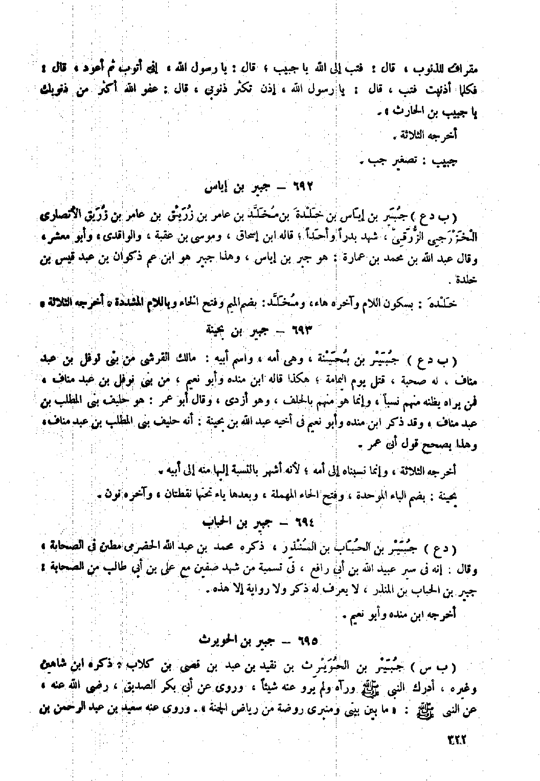 (ب د ع) جبير بْن بحينة، وهي أمه، واسم أبيه: مالك القرشي من بني نوفل بْن عبد مناف، له صحبة، قتل يَوْم اليمامة، هكذا قاله ابن منده وَأَبُو نعيم، من بني نوفل بْن عبد مناف، فمن يراه يظنه منهم نسبًا، وَإِنما هو منهم بالحلف، وهو أزدي، وقال أَبُو عمر: هو حليف بني المطلب بْن عبد مناف، وقد ذكر ابن منده وَأَبُو نعيم في أخيه عبد الله بن بحينة: أَنَّهُ حليف بني المطلب بْن عبد مناف، وهذا يصحح قول أَبِي عمر.