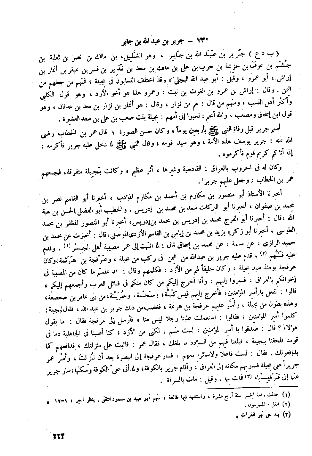 أَخْبَرَنَا الأُسْتَاذُ أَبُو مَنْصُورِ بْنُ مُكَارِمِ بْنِ أَحْمَدَ بْنِ مُكَارِمٍ الْمُؤَدِّبُ، أَخْبَرَنَا أَبُو الْقَاسِمِ نَصْرُ بْنُ مُحَمَّدِ بْنِ صَفْوَانَ، أَخْبَرَنَا أَبُو الْبَرَكَاتِ سَعْدُ بْنُ مُحَمَّدِ بْنِ إِدْرِيسَ، وَالْخَطِيبُ أَبُو الْفَضْلِ الْحَسَنُ بْنُ هِبَةِ اللَّهِ، قَالَ: أَخْبَرَنَا أَبُو الْفَرَجِ مُحَمَّدُ بْنُ إِدْرِيسَ بْنِ مُحَمَّدِ بْنِ إِدْرِيسَ، أَخْبَرَنَا أَبُو الْمَنْصُورِ الْمُظَفَّرُ بْنُ مُحَمَّدٍ الطُّوسِيُّ، أَخْبَرَنَا أَبُو زَكَرِيَّا يَزِيدُ بْنُ مُحَمَّدِ بْنِ إِيَاسِ بْنِ الْقَاسِمِ الأَزْدِيُّ الْمَوْصِلِيُّ، قَالَ: أُخْبِرْتُ عَنْ مُحَمَّدِ بْنِ حُمَيْدٍ الرَّازِيُّ، عَنْ سَلَمَةَ، عَنْ مُحَمَّدِ بْنِ إِسْحَاقَ قَالَ: لَمَّا انْتَهَتْ إِلَى عُمَرَ مُصِيبَةُ أَهْلِ الْجِسْرِ [١] ، وَقَدِمَ عَلَيْهِ فَلُّهُمْ [٢] ، قَدِمَ عَلَيْهِ جَرِيرُ بْنُ عَبْدِ اللَّهِ مِنَ الْيَمَنِ فِي رَكْبٍ مِنْ بَجِيلَةَ، وَعَرْفَجَةُ بْنُ هَرْثَمَةَ، وَكَانَ عَرْفَجَةُ يَوْمَئِذٍ سَيُّدَ بَجِيلَةَ، وَكَانَ حَلِيفًا لَهُمْ مِنَ الأَزْدِ، فَكَلَّمَهُمْ وَقَالَ: قَدْ عَلِمْتُمْ مَا كَانَ مِنَ الْمُصِيبَةِ فِي إِخْوَانِكُمْ بِالْعِرَاقِ، فَسِيرُوا إِلَيْهِمْ، وَأَنَا أُخْرِجُ إِلَيْكُمْ مَنْ كَانَ مِنْكُمْ فِي قَبَائِلِ الْعَرَبِ وَأَجْمَعُهُمْ إِلَيْكُمْ، قَالُوا: نَفْعَلُ يَا أَمِيرَ الْمُؤْمِنِينَ، فَأَخْرَجَ إِلَيْهِمْ قَيْسَ كُبَّةَ، وَسَحْمَةَ، وَعُرَيْنَةَ، مِنْ بَنِي عَامِرِ بْنِ صَعْصَعَةَ، وَهَذِهِ بُطُونٌ مِنْ بَجِيلَةَ، وَأَمَرَ عَلَيْهِمْ عَرْفَجَةَ بْنَ هَرْثَمَةَ، فَغَضِبَ مِنْ ذَلِكَ جَرِيرُ بْنُ عَبْدِ اللَّهِ، فَقَالَ لِبَجِيلَةَ: