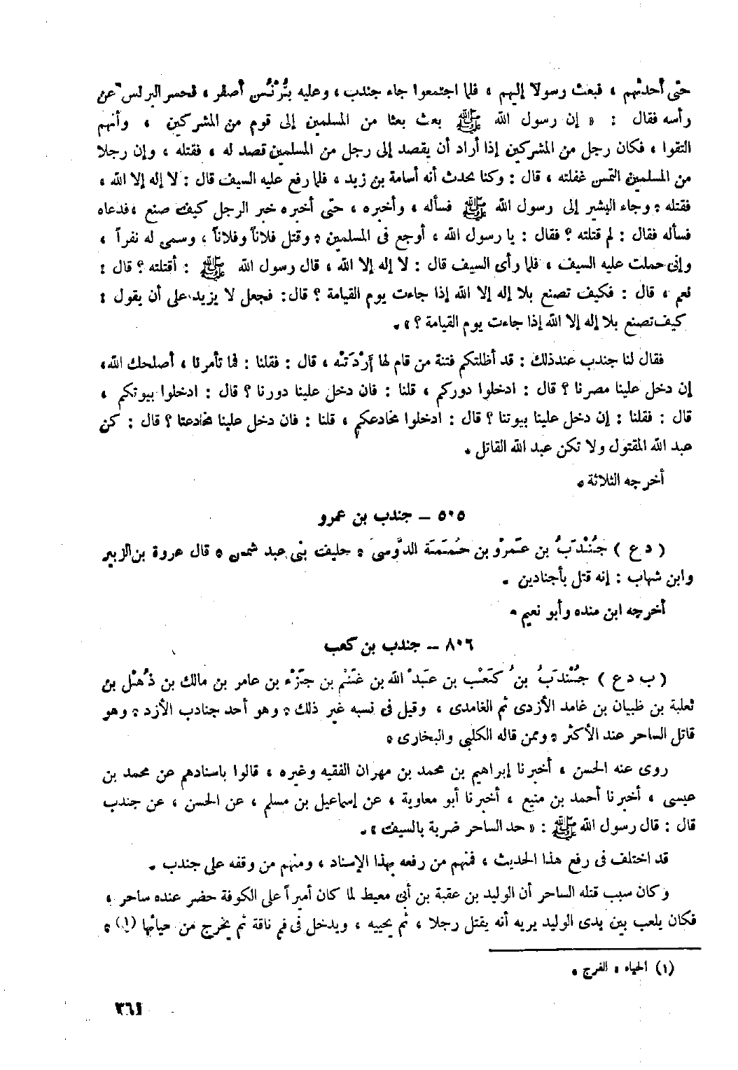 قَدِ اخْتُلِفَ فِي رَفْعِ هَذَا الْحَدِيثِ، فَمِنْهُمْ مَنْ رَفَعَهُ بِهَذَا الإِسْنَادِ، وَمِنْهُمْ مَنْ وَقَفَهُ عَلَى جُنْدَبٍ. وَكَانَ سَبَبُ قَتْلِهِ السَّاحِرَ أَنَّ الْوَلِيدَ بْنَ عُقْبَةَ بْنِ أَبِي مُعَيْطٍ لَمَّا كَانَ أَمِيرًا عَلَى الْكُوفَةِ حَضَرَ عِنْدَهُ سَاحِرٌ، فَكَانَ يَلْعَبُ بَيْنَ يَدَيِ الْوَلِيدِ يُرِيَهُ أَنَّهُ يَقْتُلُ رَجُلا، ثُمَّ يُحْيِيهِ، وَيَدْخُلُ فِي فَمِ نَاقَةٍ ثُمَّ يَخْرُجُ مِنْ حَيَائِهَا [١] .